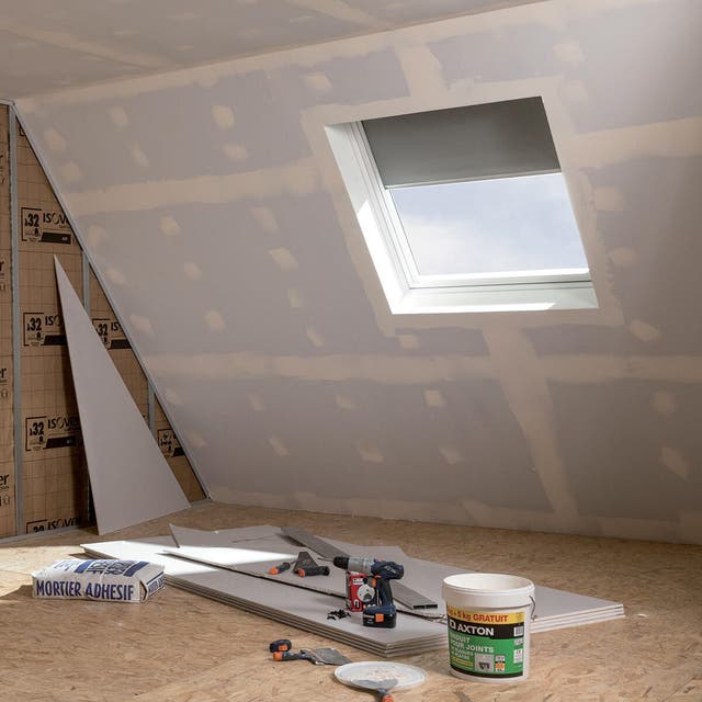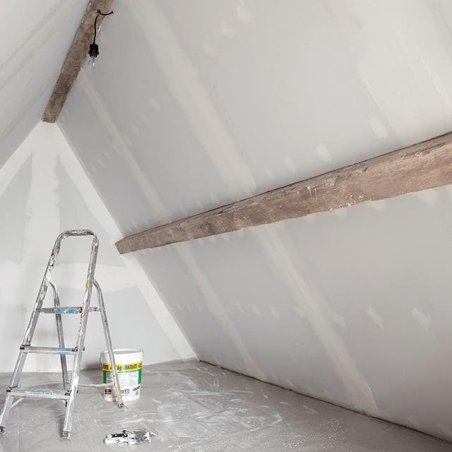 sigilla lo spazio tra il pavimento e la lastra e poi passa lo stucco sulle viti e gli angoli. Stendi il nastro per giunti ed evidenzia la giunzione. Poi stendi lo stucco. Una volta stuccate gli elementi principali stendi lo stucco sul resto della parete. Quando lo stucco è completamente asciutto, passa la pittura muraria che hai scelto.
