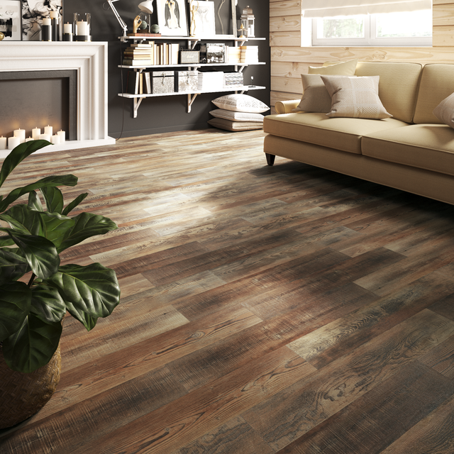 Questo pavimento SPC con posa flottante con click, ha una finitura in rilievo effetto legno e bordi microbisellati che simulano le fughe; il sottopavimento integrato garantisce un ottimo livello di insonorizzazione. Ideale per bagni e per grandi superfici fino a 400 mq senza l'utilizzo di giunti di dilatazione.