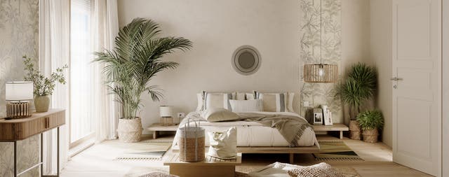 Un’accogliente camera da letto in stile boho