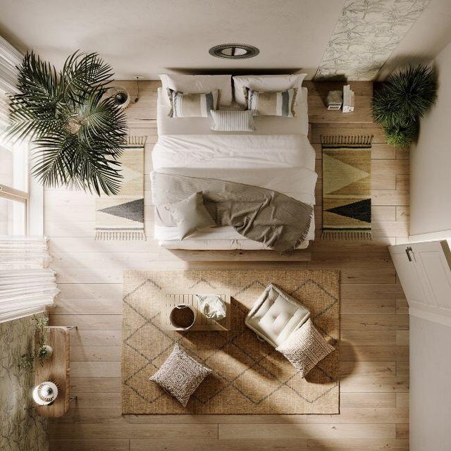Non c’è un unico tappeto in questo progetto: la camera boho viene impreziosita ulteriormente dalla scelta di introdurre questo modello scendiletto con motivo etnico, che ricalca i principali colori dell’ambiente, in un mix di sfumature calde e soffici.