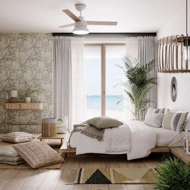 Il dettaglio moderno ma boho? Il ventilatore da soffitto con pale in legno, che riprende il leitmotiv dell’arredamento, per un risultato impeccabile. Non solo è utile e funzionale, ma è anche un complemento di design che valorizza ulteriormente la camera.