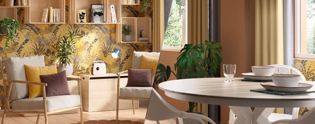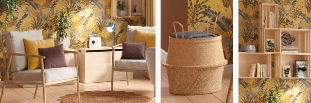 Il modo migliore per evocare il fascino esotico di viaggi vissuti e mete sognate, è attingere a pattern etnici. Motivi decorativi rubati alla natura esotica e colori polverosi di sabbia sono fonte di ispirazione da assaporare tra le mura di casa arredate con stile. La parete scenografica del piccolo soggiorno stile etnico è la chiave per immergersi in questo sogno. In perfetto equilibrio tra natura e viaggio, la carta da parati avvolge la stanza con la sua luce giallo dorata e i colori vivaci del foliage. Con la sua ricercata fantasia detta lo stile etno boho degli arredi che trasformano il soggiorno in un moderno lodge della savana, tra decori jungle e materiali naturali. Da sottolineare la particolare scelta di attrezzare la parete decorata con un sistema di mensole a cassetta. Come rami di legno chiaro che si allungano verso il cielo, sfruttano la verticalità e aumentano lo spazio contenitivo del piccolo soggiorno: scongrafiche e pratiche.
