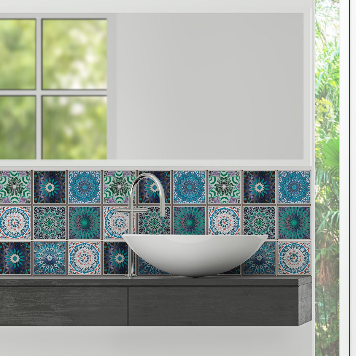 Area coperta per 1 quantità: 0.09 metro quadrato. Adesivi imitazione piastrelle boemo per decorazione della casa ! Con adesivi piastrelle di cemento boemo e questo 9 adesivi piastrelle boemo Coatzin arredare la vostra casa è molto facile! Dimensioni di adesivi per piastrelle di cemento: Per i 30 x 30 cm, le adesivi piastrelle sono 10 x 10 cm Per i 45 x 45 cm, le adesivi piastrelle sono 15 x 15 cm Per i 60 x 60 cm, le adesivi piastrelle sono 20 x 20 cm Dove questi stickers murali incollare? Questi stickers murali piastrelle boemo sono ideali per decorare le pareti della cucina e bagno.