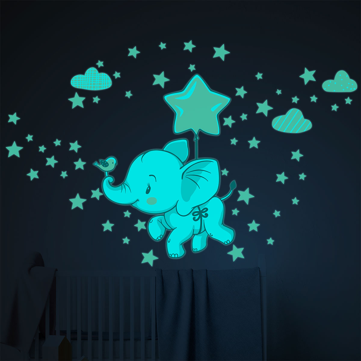 Adesivi fosforescente elefanti felici tra le nuvole + 120 stelle - Sticker adesivo - adesivi murali - 40x30cm