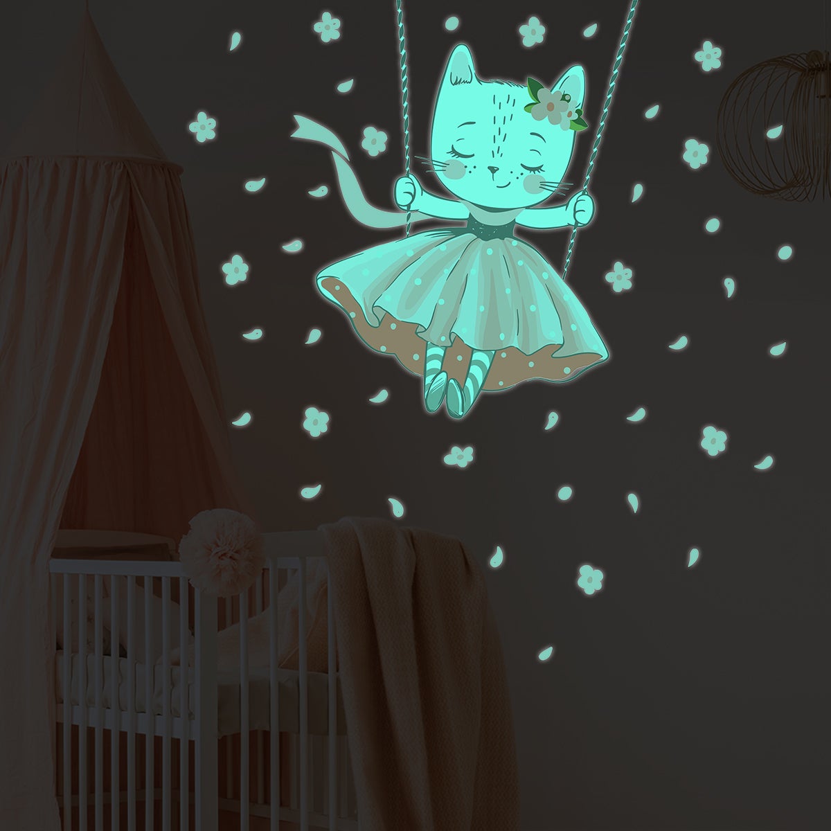 Area coperta per 1 quantità: 0.60 metro quadrato.Adesivi fosforescente per decorazione della casa ! Con adesivi fosforescente e questo Adesivo fosforescente gatto che balla arredare la vostra casa è molto facile! Dimensioni degli adesivi fosforescenti animali: Questo adesivo decorativo per la cameretta dei bambini è composto da: 1 adesivo con gatto ballerino sull'altalena, 12 adesivi con fiori e 25 adesivi con petali. Per le dimensioni della tavola H35 x L30 cm, l'adesivo del gatto che balla sull'altalena misura H35 x L30 cm, un adesivo con un fiore misura H2,5 x L2,5 cm, un adesivo con un petalo misura H1,5 x L1 cm. Per la dimensione della tavola H70 x L60 cm, l'adesivo del gatto ballerino sull'altalena misura H70 x L60 cm, un adesivo floreale misura H5,5 x L5 cm, un adesivo petalo Misura H3,5 x L2 cm. Per la dimensione della tavola H145 x L120 cm, l'adesivo del gatto ballerino sull'altalena misura H145 x L120 cm, un adesivo con un fiore misura H11 x L9,5 cm, un adesivo con un petalo misura H6,5 x L4 cm. Dove questi stickers murali incollare? Questi stickers murali sono ideali per decorare le pareti della vostra camera o quelli della cameratta dei bambini!