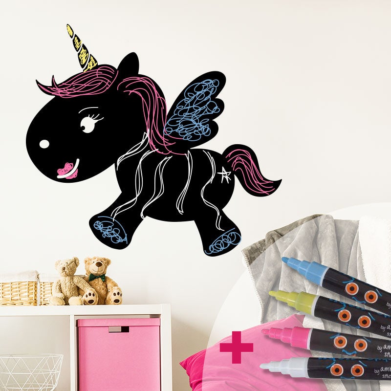 Adesivo lavagna unicorno bambino + 4 gessi liquidi - Sticker adesivo - adesivi murali - 35x40cm