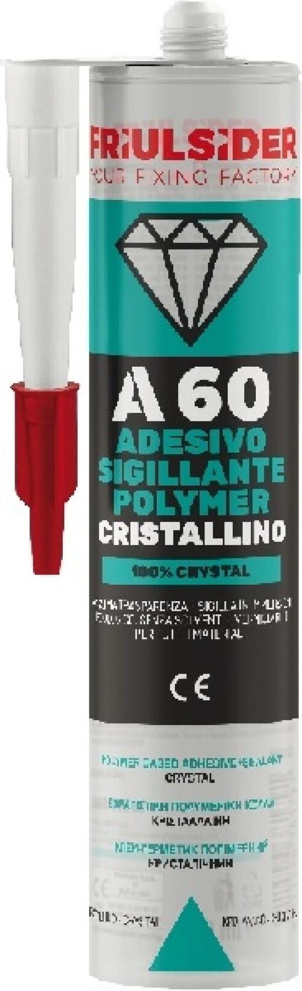 A60 è un adesivo sigillante professionale trasparente cristallino basato su tecnologia a polimeri modificati (ibridi). Adatto in tutti quegli incollaggi dove le sue caratteristiche di cristallinità permettono accoppiamenti estetici. Una volta estruso reagisce grazie all'umidità presente nell'atmosfera e nei materiali ed assicura incollaggi ad alte prestazioni restando permanentemente flessibile ed elastico. Caratterizzato da una buona tixotropia ha un ottima presa iniziale e garantisce accoppiamenti multi materiale con linea collante perfettamente trasparente anche in spessore.