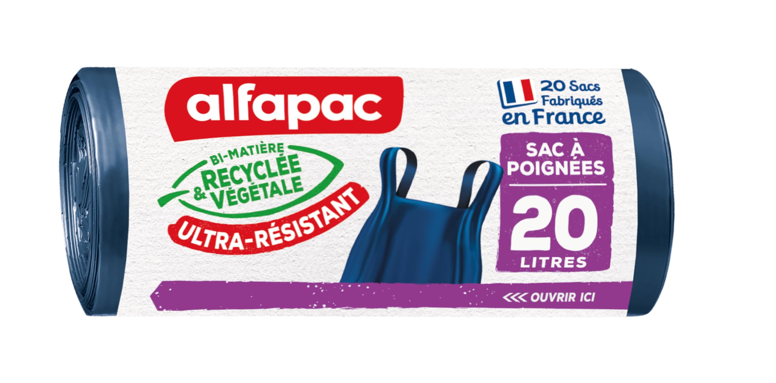 Alfapac - 20 Sacchetti per la Spazzatura 20 l, con Manici Resistenti, Realizzati in Francia - Bimateriale Riciclato e vegetale