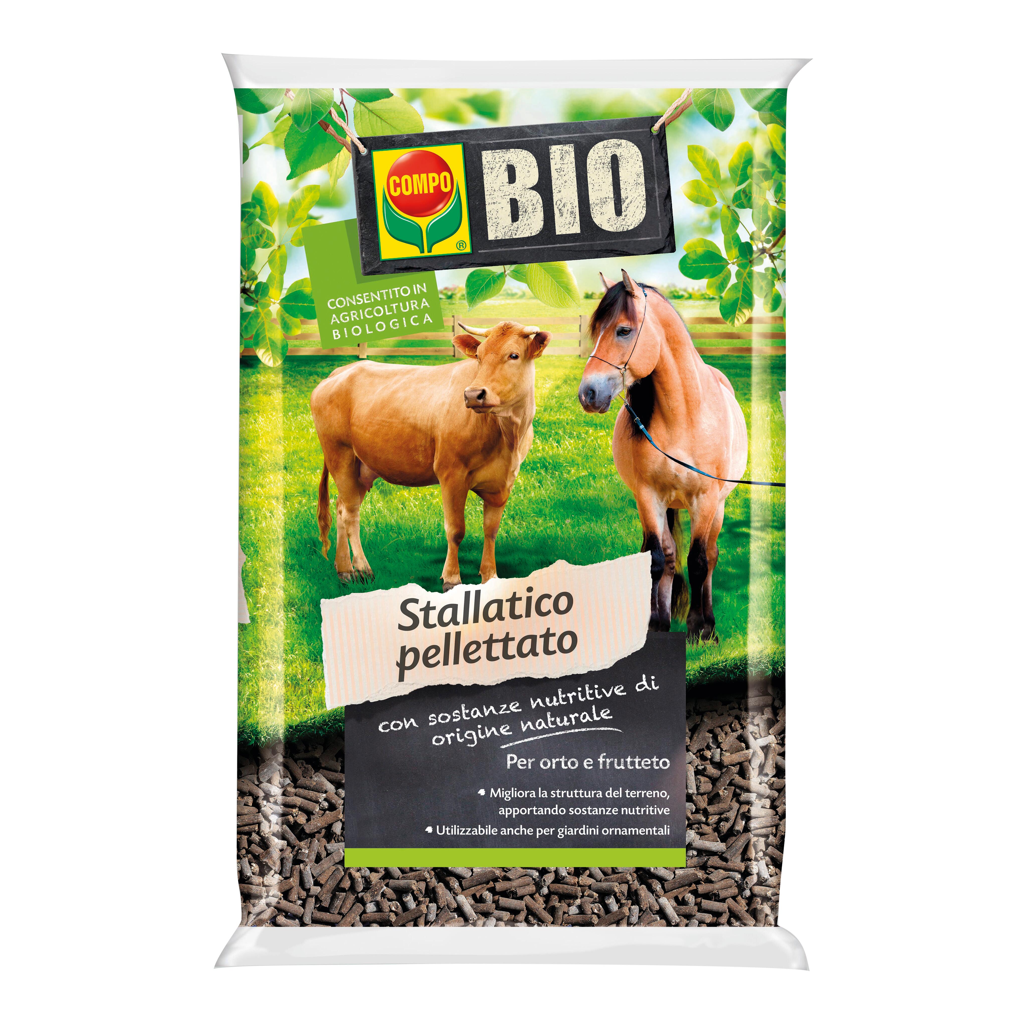 COMPO BIO Stallatico Pellettato è letame di antica tradizione contadina con tutti gli elementi nutritivi, gli acidi umici e fulvici intatti, grazie alla sua rilavorazione in chiave moderna. La flora batterica, propria dell’humus, viene infatti preservata grazie alla disidratazione a bassa temperatura. Esente da salmonelle e germi patogeni, il prodotto è consentito in agricoltura biologica, in sostituzione della tradizionale letamazione dei terreni. La forma pellettata ne facilita la distribuzione.