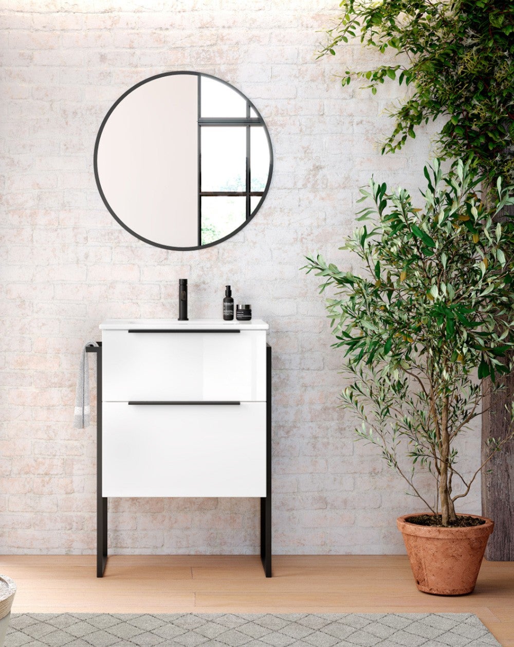 - Set mobile da bagno design industriale a terra con 2 cassetti più lavabo in ceramica. I cassetti hanno finitura con texture e il cassetto superiore è dotato di organizzatore e salvasifone. Il cassetto inferiore offre la massima capacità. I frontali dei cassetti sono regolabili in orizzontale e verticale. Questi cassetti sono dotati delle migliori guide sul mercato Hettich, che garantiscono scorrimento fluido e chiusura ammortizzata.