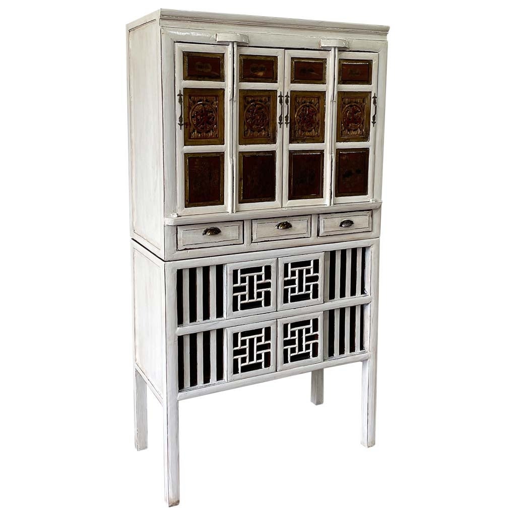Elegante armadio in legno laccato bianco con uno stile orientale distintivo. Misure: 96 cm di larghezza, 42 cm di profondità e 175 cm di altezza. Un pezzo funzionale.