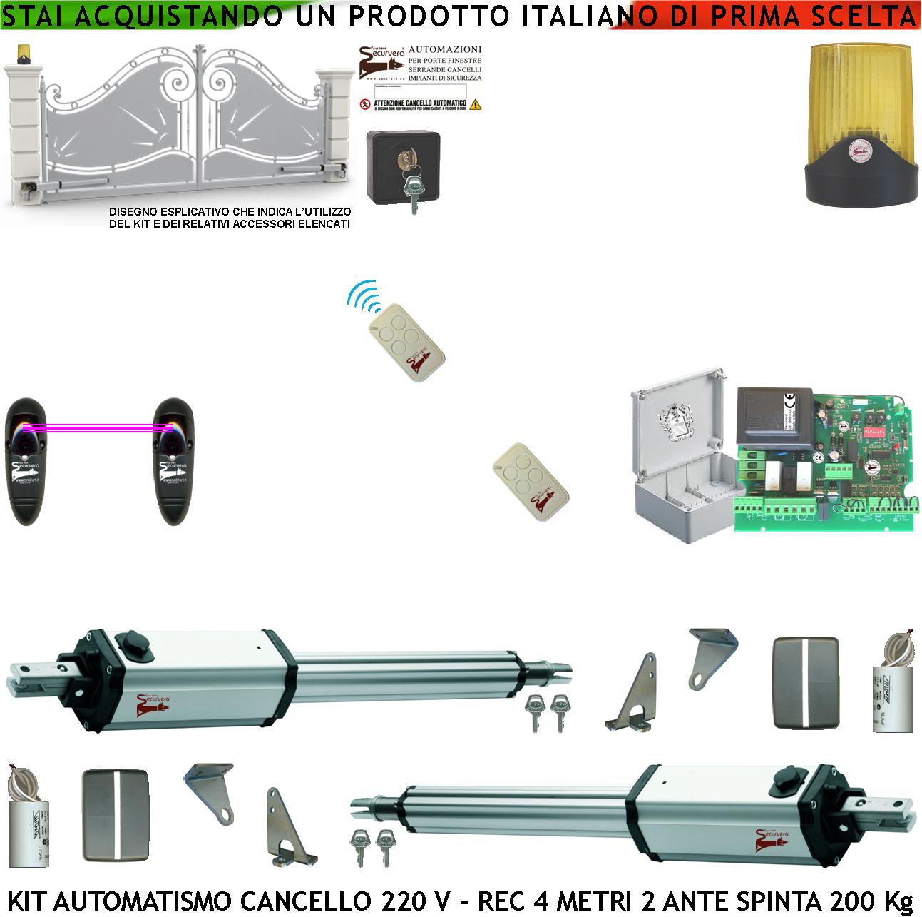 Automatismo Cancello 4 MT 2 Ante Kit 2 Motori 230 V Stelo Retrattile 2 Radiocomandi Fotocellule Faro Selettore Cartello Monitore Centrale Riprogrammab