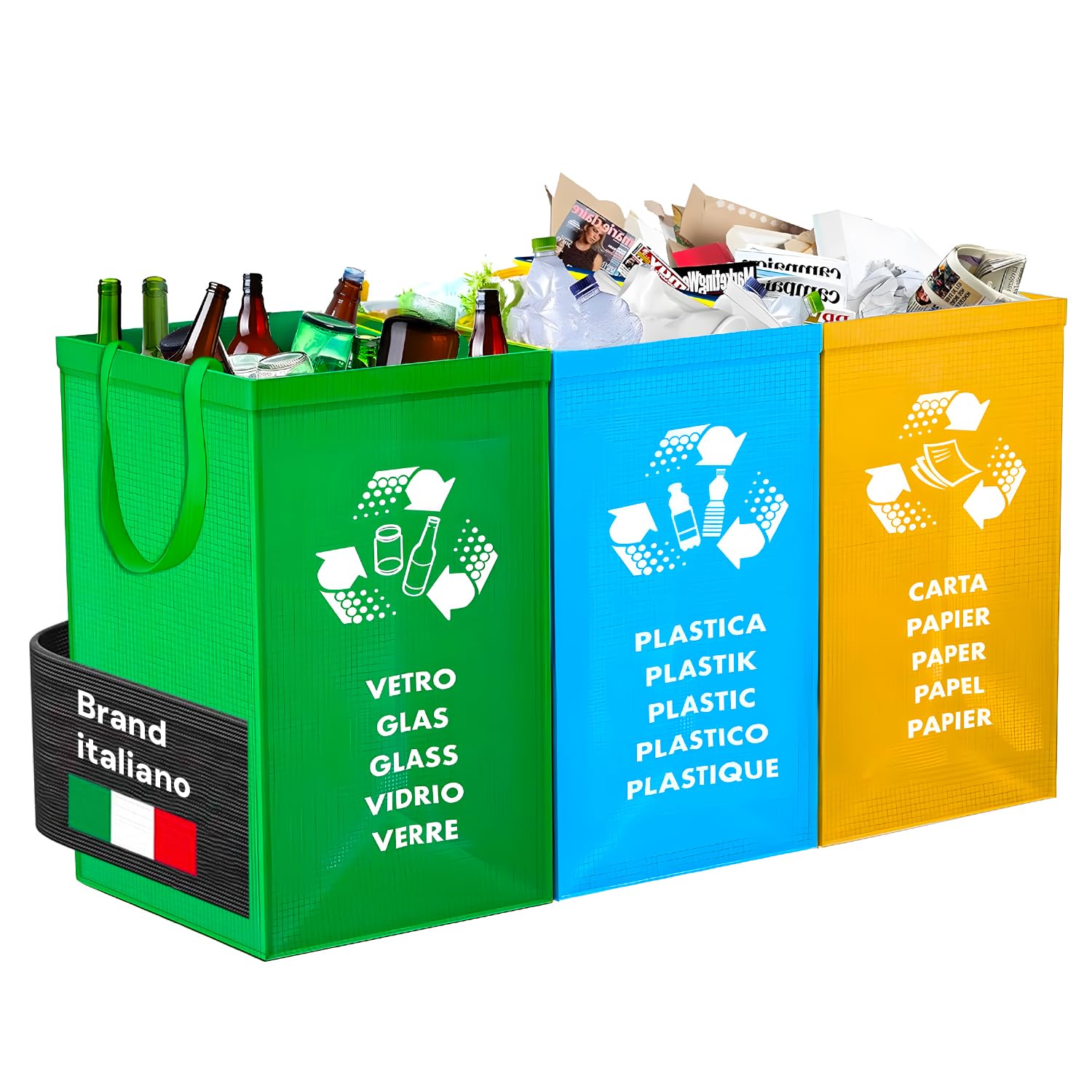 Avilia Set 3 Borse Raccolta Differenziata Lavabili - Kit Sacchi per Spazzatura Colorati per Vetro, Carta e Plastica, con Manici, in PVC - 49.5x19.5/22