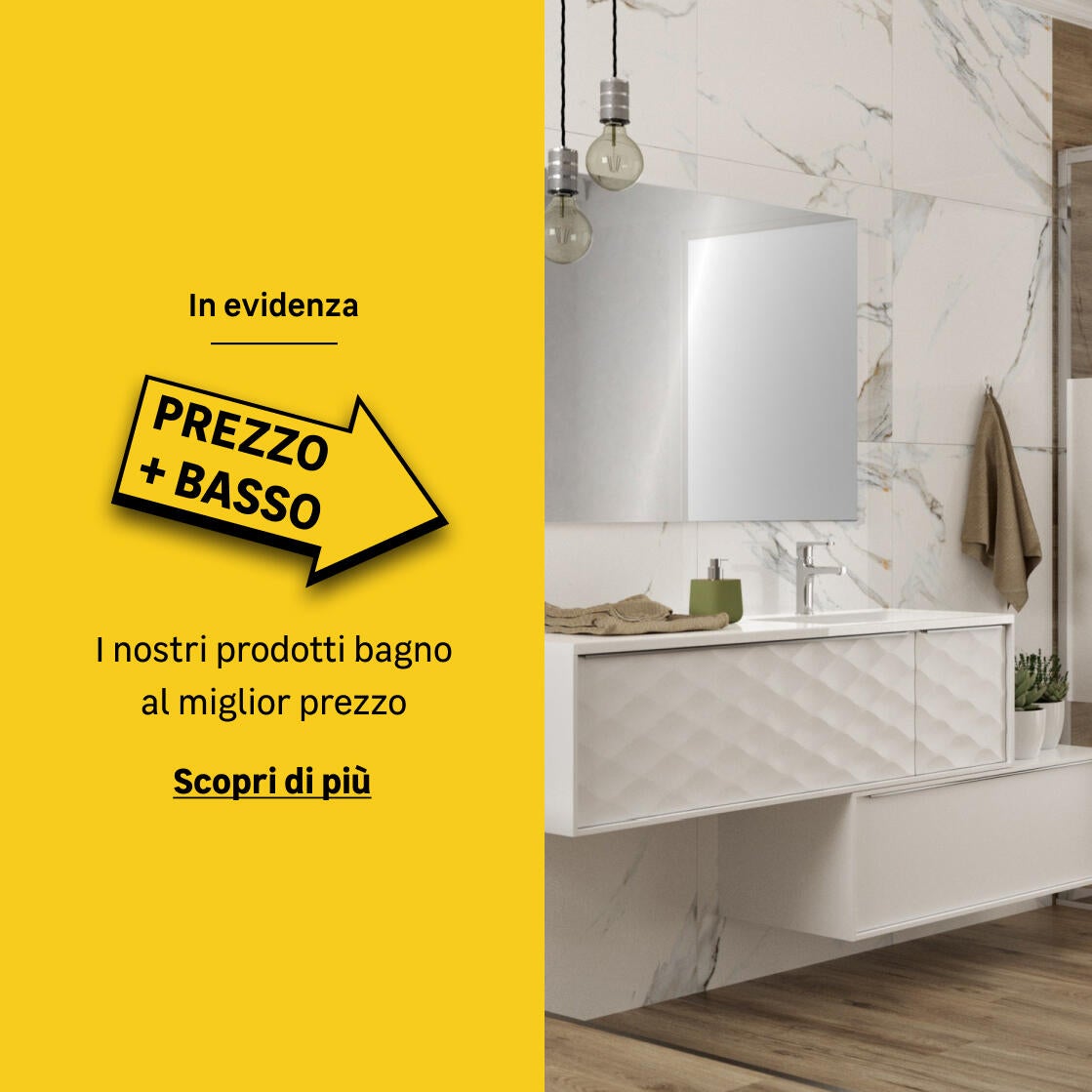 Dopo una lunga giornata fuori casa, finalmente un po’ di relax… Piccolo o grande che sia, il tuo bagno è sempre il regno del benessere. Preferisci una doccia rivitalizzante o un bel bagno caldo? A ognuno il suo, i gusti non si discutono. Un box doccia, o se gli spazi lo consentono un walk in, è il luogo deputato a rigenerarsi e portare via tutta la stanchezza in pochi minuti. Però la vasca da bagno è un toccasana per la mente e il corpo e per dedicare un po’ di tempo a sé stessi. E se fosse una vasca idromassaggio? Se pensi che sia solo un sogno, vogliamo che tu ti ricreda. Con noi è una realtà accessibile a tutti. Spesso però nella vita si cambia e allora ecco che la tua amata e comoda vasca può trasformarsi una grande e ampia doccia. Pensiamo a tutto noi! E se le pareti fossero un prezioso mosaico, delle tonalità di colore che ami di più, dai riflessi cangianti e preziosi? Oppure piastrelle, ceramiche e rivestimenti di ogni materiale, colore e formato. Un bagno prezioso è anche un bagno ben illuminato e allora perché non sognare una plafoniera speciale o applique da posizionare vicino allo specchio. E nella zona della vasca o della doccia, potrebbero essere davvero indispensabili dei faretti dalla luce multicolor per concedersi un po’ di cromoterapia, come in vero centro benessere. Un mobile da bagno per riporre tutti i prodotti di bellezza e per la cura del corpo, o la biancheria da bagno? Hai l’imbarazzo della scelta tra colori e finiture. Moderni lavabi da appoggio oppure classici lavandini a colonna, sempre ben coordinati con la serie dei sanitari, vasi e bidet, che possono essere da appoggio oppure sospesi. La scelta dei rubinetti per lavabo, bidet, doccia oppure vasca, così come le colonne doccia e i pannelli idromassaggio non possono che completare l’effetto benefico del contatto con l’acqua e farti sentire come in una SPA. È sempre il dettaglio che fa la differenza, e anche in bagno puoi scegliere gli accessori che ti piacciono, che si adattano allo stile del tuo bagno e che sono più funzionali. Potrebbero essere da fissare alla parete o da appoggio: il portasapone, il porta rotolo, il porta bicchiere, porta scopino, appendini, mensole da bagno, porta phon e porta spugne. Nei nostri negozi e sul nostro sito puoi trovare tutto ciò che occorre per progettare e realizzare il bagno dei tuoi sogni. Tu scegli ciò che desideri e noi lo posiamo per te. Puoi comprare online e ricevere tutto comodamente a casa, oppure, con il servizio clicca e ritira, puoi ritirare gratuitamente il tuo ordine in negozio.