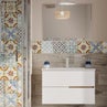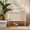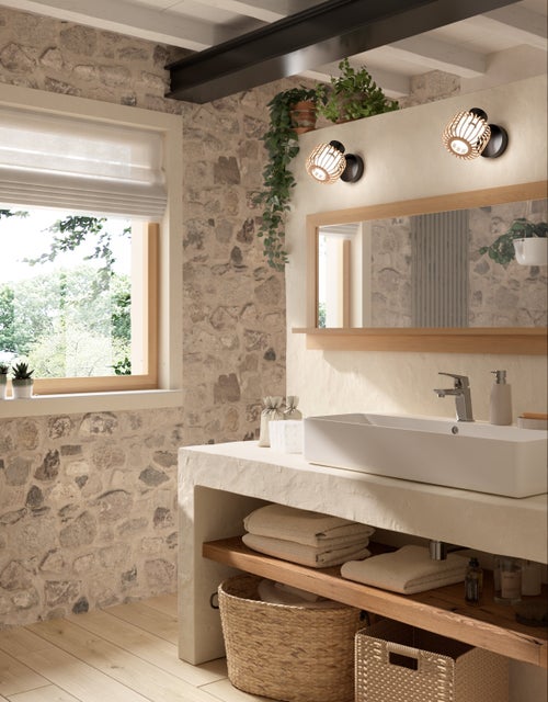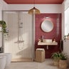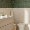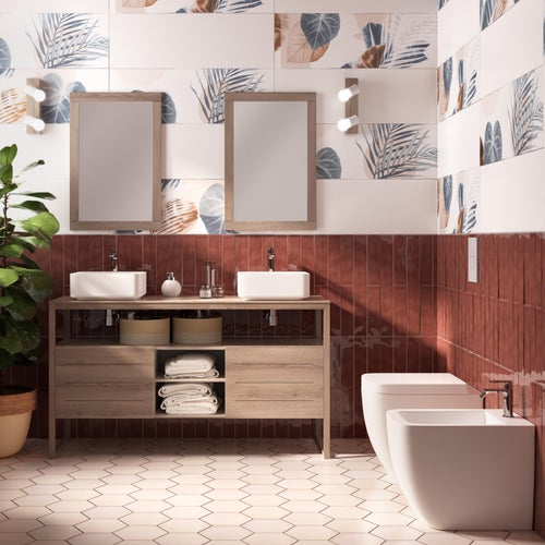 In questo bagno i dettagli naturali creano un’atmosfera distesa e profondamente rilassante grazie alle tonalità della terra: la base color sabbia incontra il carattere deciso del borgogna. A queste si aggiunge la finitura opaca delle piastrelle, scelta sia per il pavimento in gres effetto pietra che per il rivestimento, per valorizzare le superfici che risultano estremamente naturali.