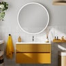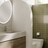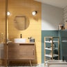 Segue il fil rouge dell’ambiente anche la tonalità scelta per il soffitto, che richiama il colore delle piastrelle della zona lavabo, per esaltare il mobile bagno, dalle linee essenziali, con piano effetto legno abbinato a un lavabo d’appoggio tondo con rubinetteria cromata, che introduce un punto luce delicato.