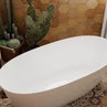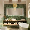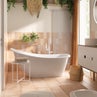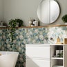 Immancabili i dettagli che definiscono lo stile boho per eccellenza: mensole in midollino, un ceppo di legno grezzo e la sospensione in fibre naturali. Il tocco green delle piante e gli accessori completano il tutto, per un bagno di grande impatto.