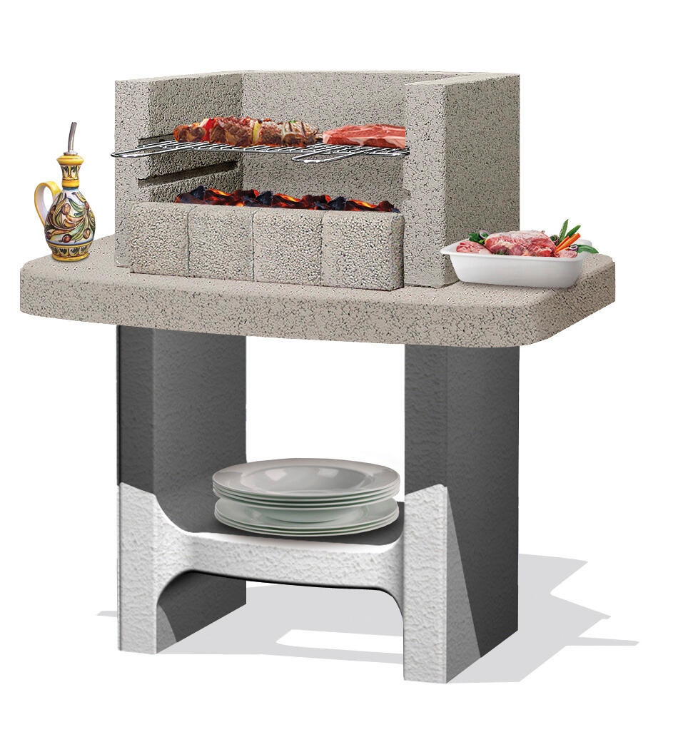 Barbecue in calcestruzzo alleggerito. Piano lavoro con superficie d’appoggio laterale. Focolare con griglia di cottura cromata, regolabile in 2 altezze. Base con pratico ripiano. Piano lavoro e Safe Grill tinti nell’impasto.