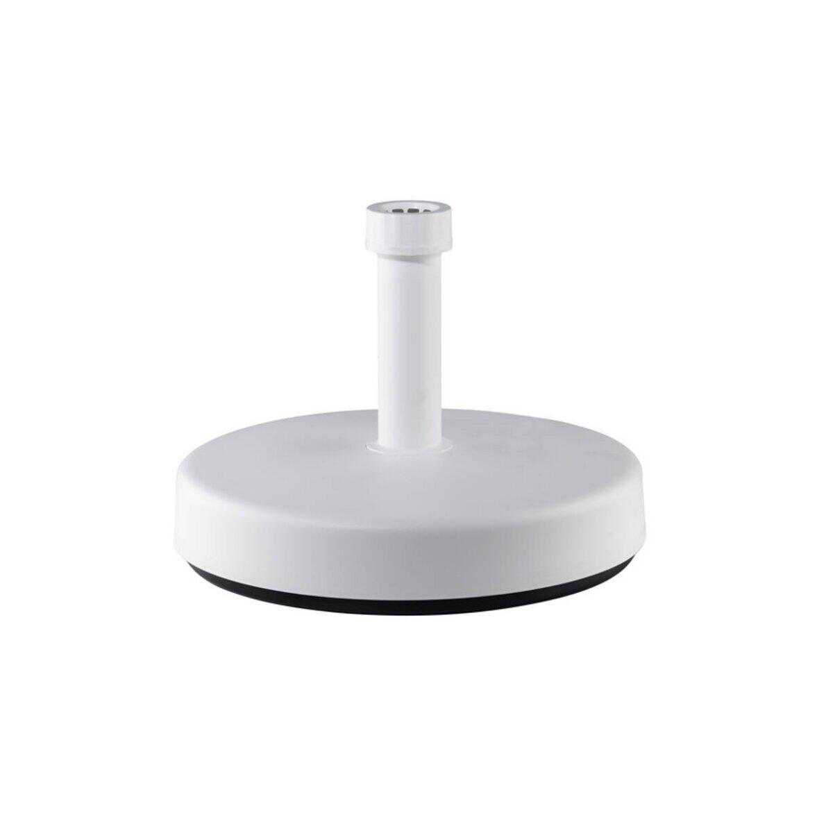 Base tonda per ombrellone riempibile fino a 25 kg. Realizzata in resina di colore bianco. Con tubo aderente. Misure: 46 x 46 x 11 cm (larghezza x lunghezza x altezza). Peso: vuota 2,5 kg, riempita 25 kg.