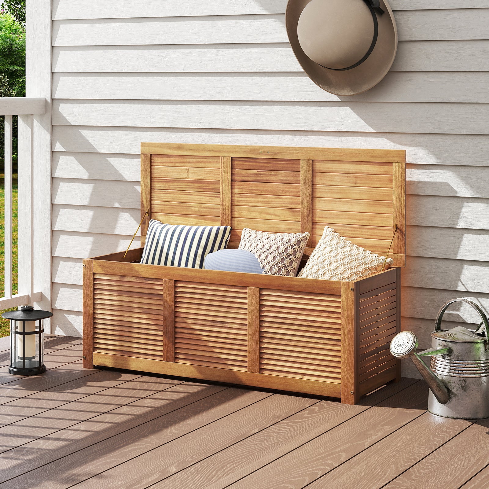 Stai cercando una scatola in cui riporre vari oggetti? La nostra scatola sarà la soluzione ideale per conservare ciò che vuoi e puoi usarla anche come posto in cui riposarti. Realizzata in legno di acacia e ricoperta in teak, la scatola è durevole. Il grande spazio interno è ideale per riporre attrezzi da giardinaggio, attrezzatura da fitness, cuscini, giocattoli, ecc. La maniglia rotonda sulla parte superiore ti fa accedere facilmente agli oggetti. Questa scatola si può usare anche come panca e regge fino a 160 kg. Se vuoi avere un posto in cui riposarti dopo aver fatto giardinaggio, compra questa scatola multifunzionale!