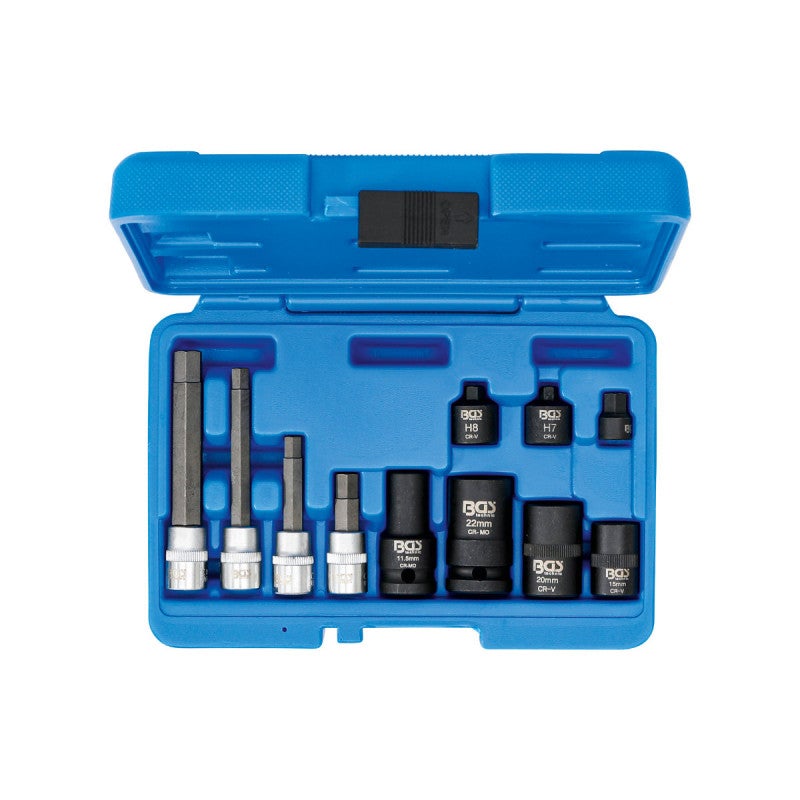 Per smontare i pistoni dei freni quando si sostituiscono le pastiglie dei freni Adatto ai seguenti veicoli: Audi A4, A5, S5, Q5, Q7, S8 Porsche Cayenne, Macan, Cayman Mercedes-Benz Ford BMW Alfa Romeo Oggetto della fornitura: 1 inserto: 10 mm (3/8"), Lunghezza: 100 mm, esagono interno 11 mm 1 inserto: 10 mm (3/8"), Lunghezza: 92 mm, esagono interno 7 mm 1 inserto: 10 mm (3/8"), Lunghezza: 65 mm, esagono interno 7 mm 1 inserto: 10 mm (3/8"), Lunghezza: 50 mm, esagono interno 9 mm 1 inserto per pinze freno: 10 mm (3/8"), Lunghezza: 24 mm, esagono interno 8 mm (BGS 4996) 1 inserto per pinze freno: 10 mm (3/8"), Lunghezza: 24 mm, esagono interno 7 mm (BGS 4995) 1 inserto per pinze freno: 6,3 mm (1/4"), Lunghezza: 24 mm, esagono interno 9 mm (BGS 4997) 1 inserto per pinze freno: 12,5 mm (1/2"), Lunghezza: 50 mm, decagono 11,5 mm (BGS 5292) 1 inserto per pinze freno: 12,5 mm (1/2"), Lunghezza: 38 mm, decagono 20 mm (BGS 9631) 1 inserto per pinze freno: 12,5 mm (1/2"), Lunghezza: 30 mm, decagono 15 mm (BGS 9629) 1 inserto speciale per chiavi a tubo: 12,5 mm (1/2"), Lunghezza: 48 mm, ettagono 22 mm (BGS 6706)