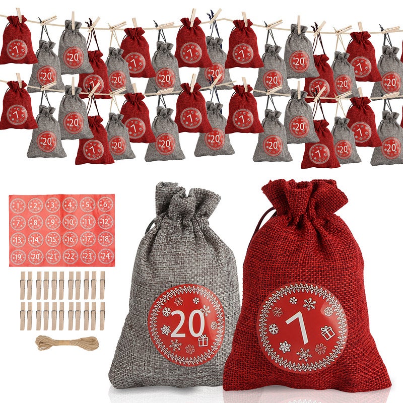 - SACCHETTI REGALO MULTIUSO Il calendario dell'avvento con conto alla rovescia è un'aggiunta perfetta alle vostre decorazioni natalizie. Potete scegliere se inserire in ogni sacchetto un regalo di Natale, un giocattolo o un dolcetto. I sacchetti di iuta possono essere utilizzati come calendari dell'Avvento da riempire, come decorazioni per matrimoni, battesimi, compleanni di bambini e Ringraziamento.
