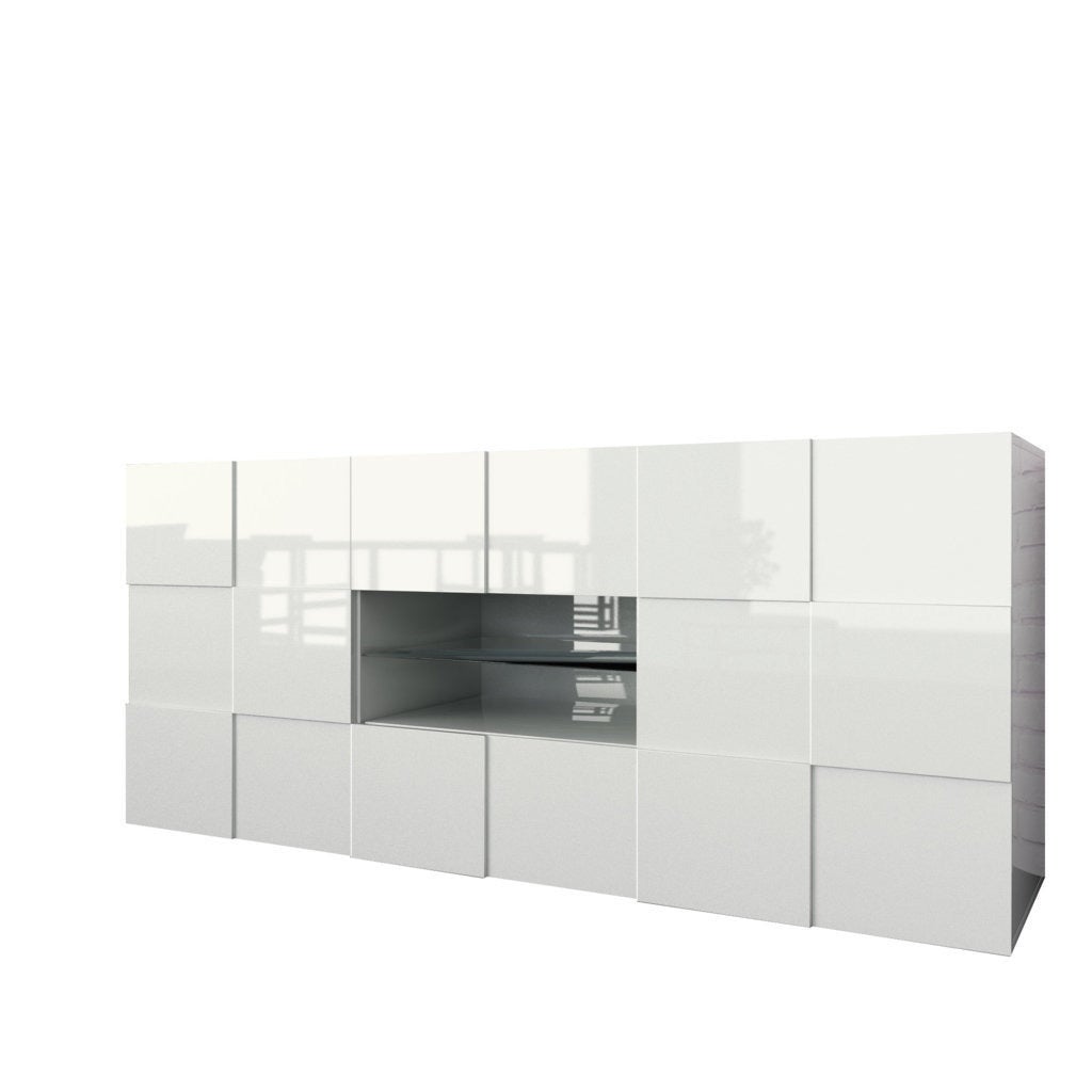 Buffet LONDON bianco • completamente realizzato in melaminico antigraffio laccato bianco lucido • frontali realizzati con effetto scacchiera • nr.2 cassetti • nr.2 ante con apertura reversibile dx/sx in fase di montaggio • nr.4 ripiani interni colore bianco opaco • nr.1 ripiano a giorno in vetro temperato • portata top max Kg. 30 • portata singolo ripiano max Kg. 10 • dimensioni ripiano cm. L.57,7 P.38 • dimensioni cm. L.180 P.42 H.84 • predisposto per kit led (non incluso) • Made In Italy
