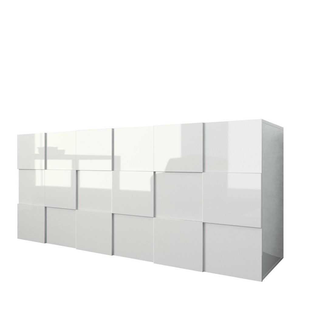 Buffet LONDON bianco • completamente realizzato in melaminico antigraffio laccato bianco lucido • frontali realizzati con effetto scacchiera • nr.3 ante con apertura reversibile dx/sx in fase di montaggio • nr.6 ripiani interni colore bianco opaco • portata top max Kg. 30 • portata singolo ripiano max Kg. 10 • dimensioni ripiano cm. L.57,7 P.38 • dimensioni cm. L.180 P.42 H.84 • Made In Italy