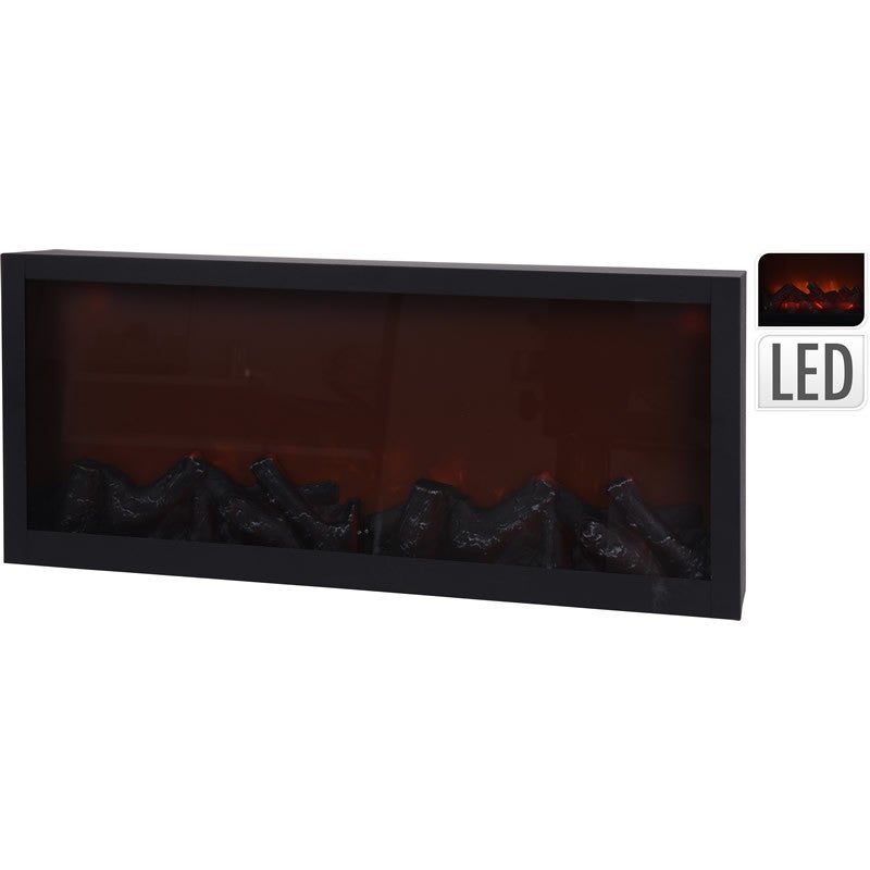 Caminetto elettrico con illuminazione a LED e rivestimento in metallo nero. Il frontale in vetro simula la combustione della legna e delle fiamme. Versatile e facile da appendere ovunque grazie alle aperture. Include un cavo da 150 cm. Dimensioni compatte
