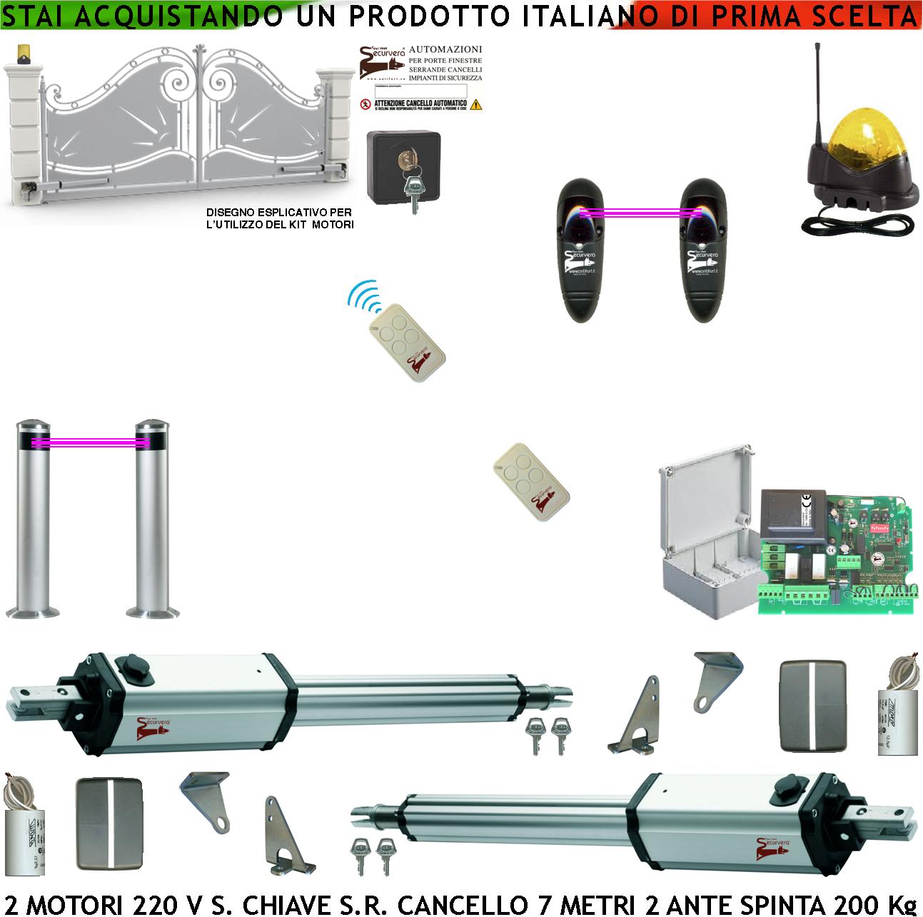 SV-KPS ,Automatismo Base Completo di Due Motoriduttori ,elettromeccanici ,Stelo Retrattile Irreversibile (Sblocco a Chiave). Caratteristiche singolo motore: Alimentazione ,220/230 V. 50 Hz. Assorbimento 1 A. ,Corsa ,Stelo 600 mm. Per cancello ad anta ,fino a ,3,5 metri. ,Condensatori ,12,5 µ,F 400 V. Giri motore 800. Potenza 250 W. Spinta 250 Kg. Protezione termica 135°,. Grado di protezione IP 55. Rumore 30 dBA. Funziona ,perfettamente da - 20°, C / + 55°,. Protezione elettrica sul comune con ,termofusibile ripristinabile ,a 140°,. ,Dotato di staffe Ambidestre copristaffe e bulloni di Fissaggio. Giunto di allineamento in alluminio con funzine di ,Parastrappi. ,Angolo di apertura max fino a 110°,. Tempo di Apertura/Chiusura ,15. ,Motore ,Ambidestro Libero ,senza blocco. ,Corpo in ,profilato di alluminio. Dimensioni rilevabili dal manuale (o ,scheda tecnica) allegato all'inser