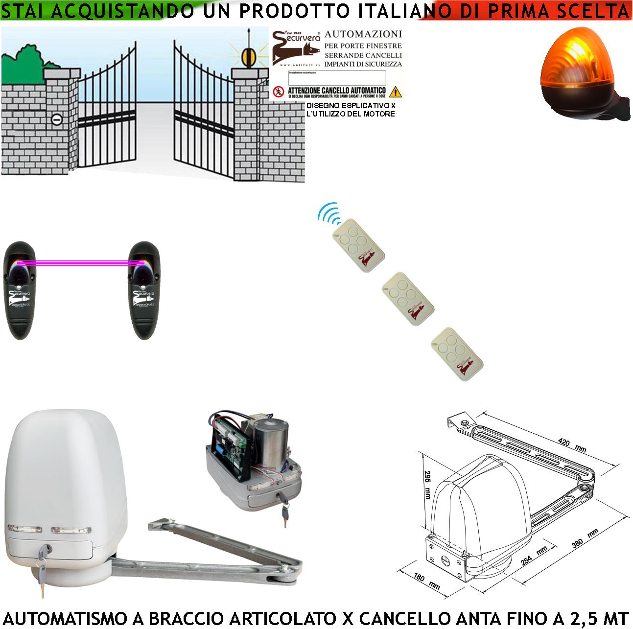 CANCELLO ELETTRICO KIT MOTORE A BRACCIO ARTICOLATO 230/24 V ANTA BATTENTE DA 0,5 A 2,5 MT CENTRALE 3 RADIOCOMANDI FARO FOTOCELLULE