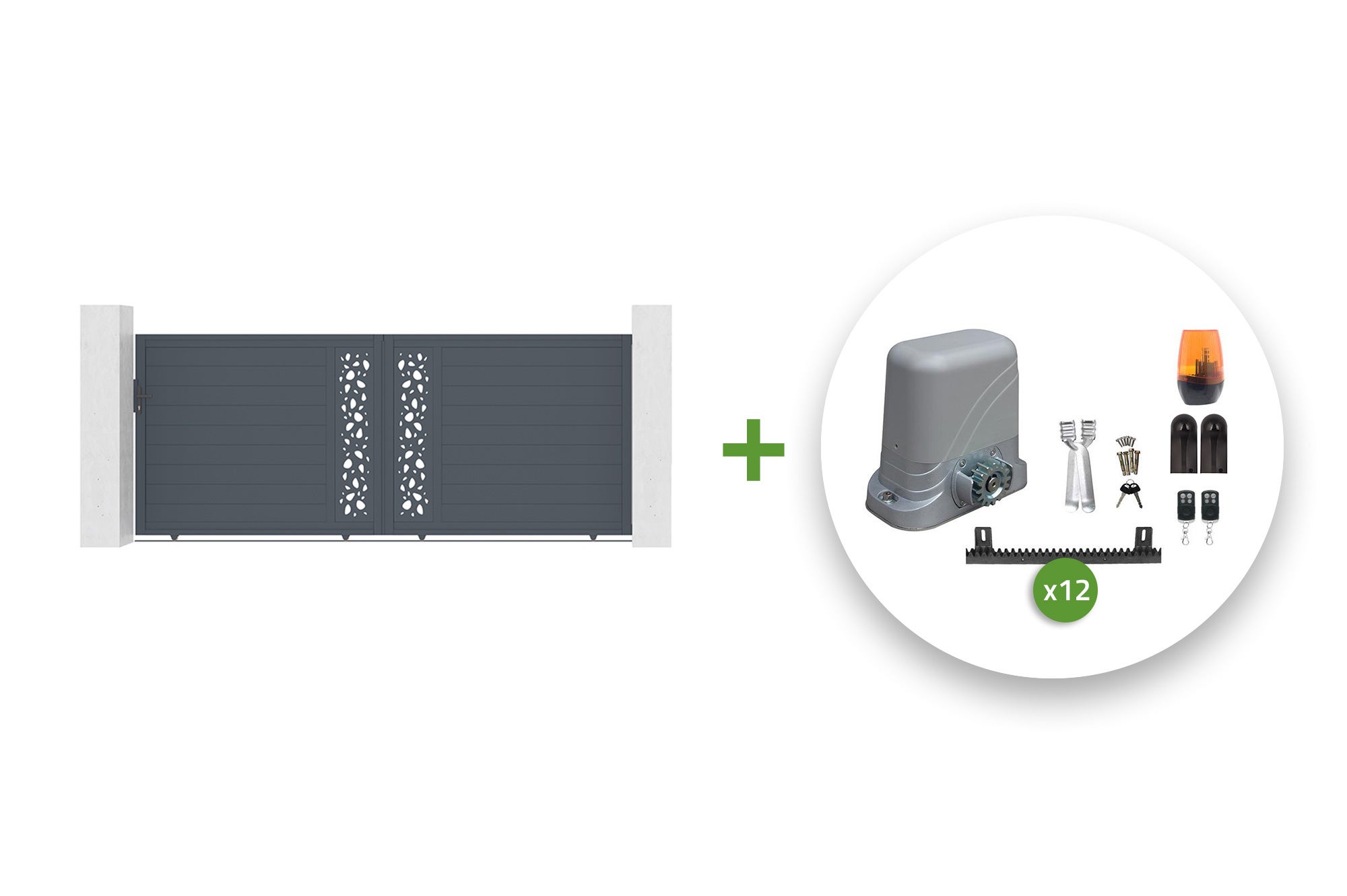 Queste pacchetti contengono un cancello scorrevole in alluminio a scelta e due pali in alluminio adatti a questo cancello.