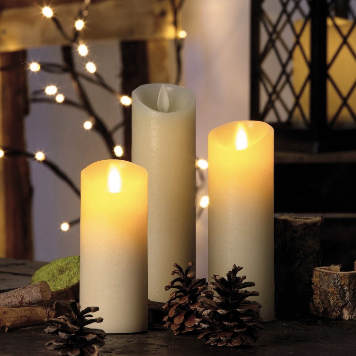 Set di 3 Candele Ø 5,2cm colore avorio rustic, altezze 12,5 / 15 / 17,5 cm. Luce led classic, con fiamma in movimento
