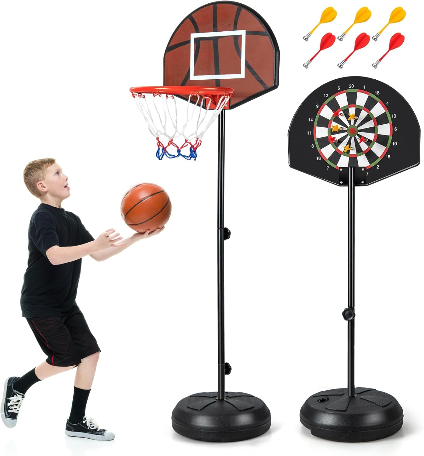 Canestro da Basket per Bambini da Esterno ed Interno, Canestro da Basket 2-in-1 con Bersaglio, 6 Freccette, Base Riempibile e Supporto per Can