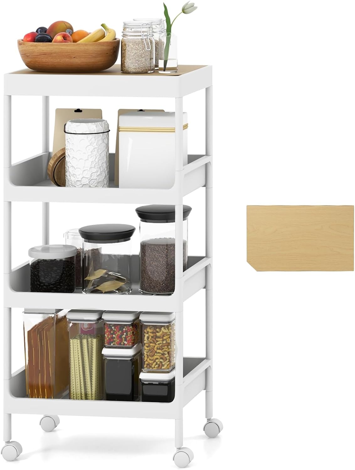 Il nostro carrello non è solo versatile ma anche elegante, rendendolo una soluzione essenziale per qualsiasi spazio in casa o ufficio. Con ampio spazio per conservare tutti i tuoi oggetti domestici e un design con coperchio superiore rimovibile, puoi posizionare un laptop, riviste, libri o tazze per una comodità extra. La robusta struttura in PP bianco e il coperchio superiore in MDF rendono il carrello resistente e facile da pulire. Inoltre, le ruote scorrevoli, di cui due bloccabili, rendono facile spostare il carrello, mantenere la stabilità e ottimizzare l'utilizzo dello spazio in qualsiasi area desiderata. In aggiunta, il suo design unico massimizza efficacemente lo spazio ed è ideale per aree strette, rendendolo una soluzione funzionale e alla moda. Investi oggi nel nostro carrello e goditi una comodità e un'organizzazione senza pari a portata di mano.