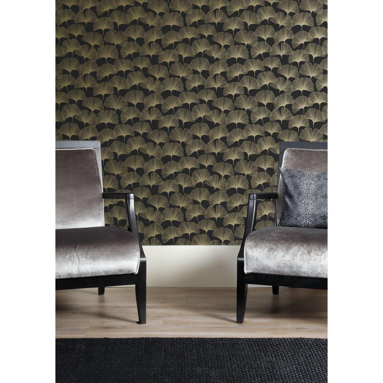 Carta da parati Esta Foglie Ginko nero e oro, 53 cm x 10.05 m