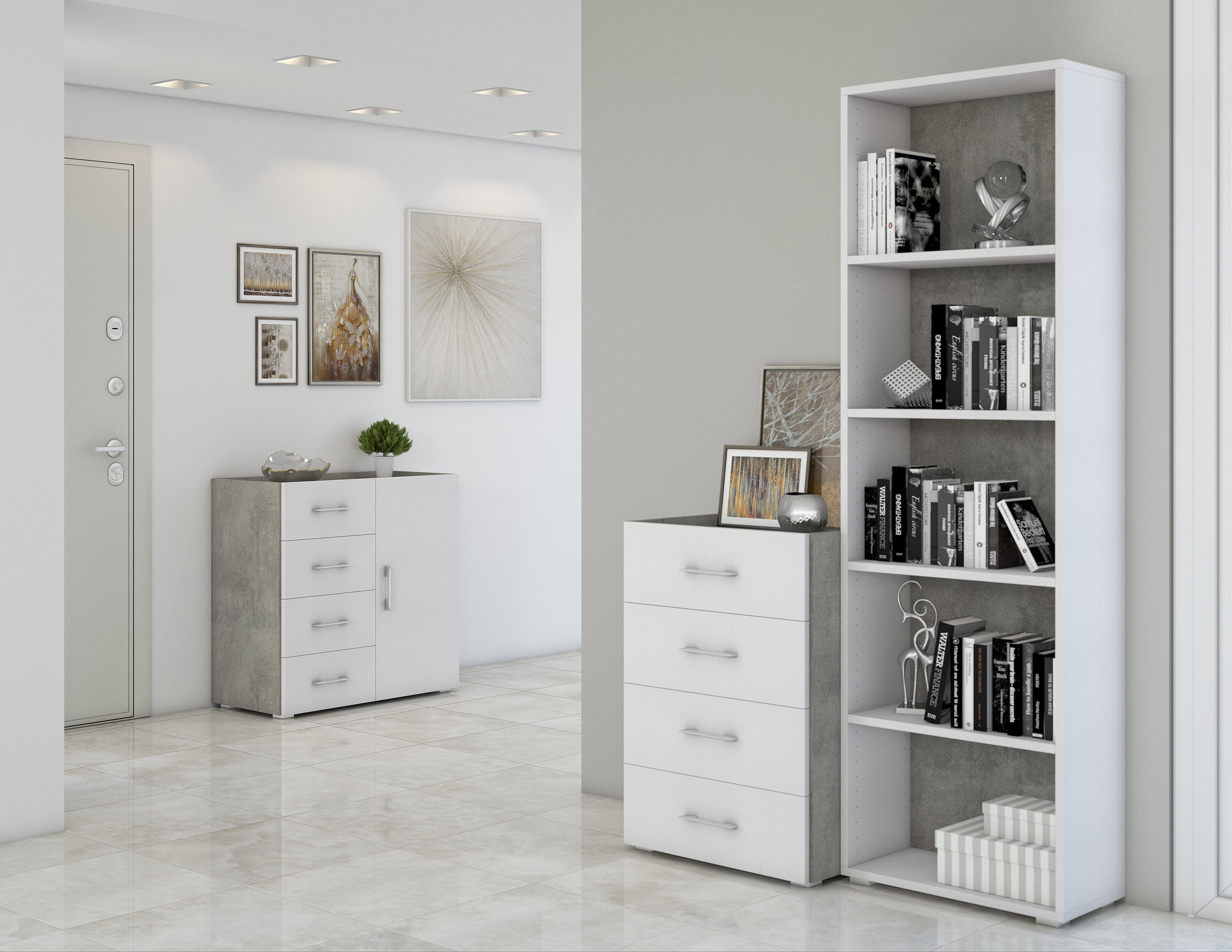 cassettiera 4 cassetti con struttura cemento e ante bianco, guide in metallo, piedini, vassoio contenitore