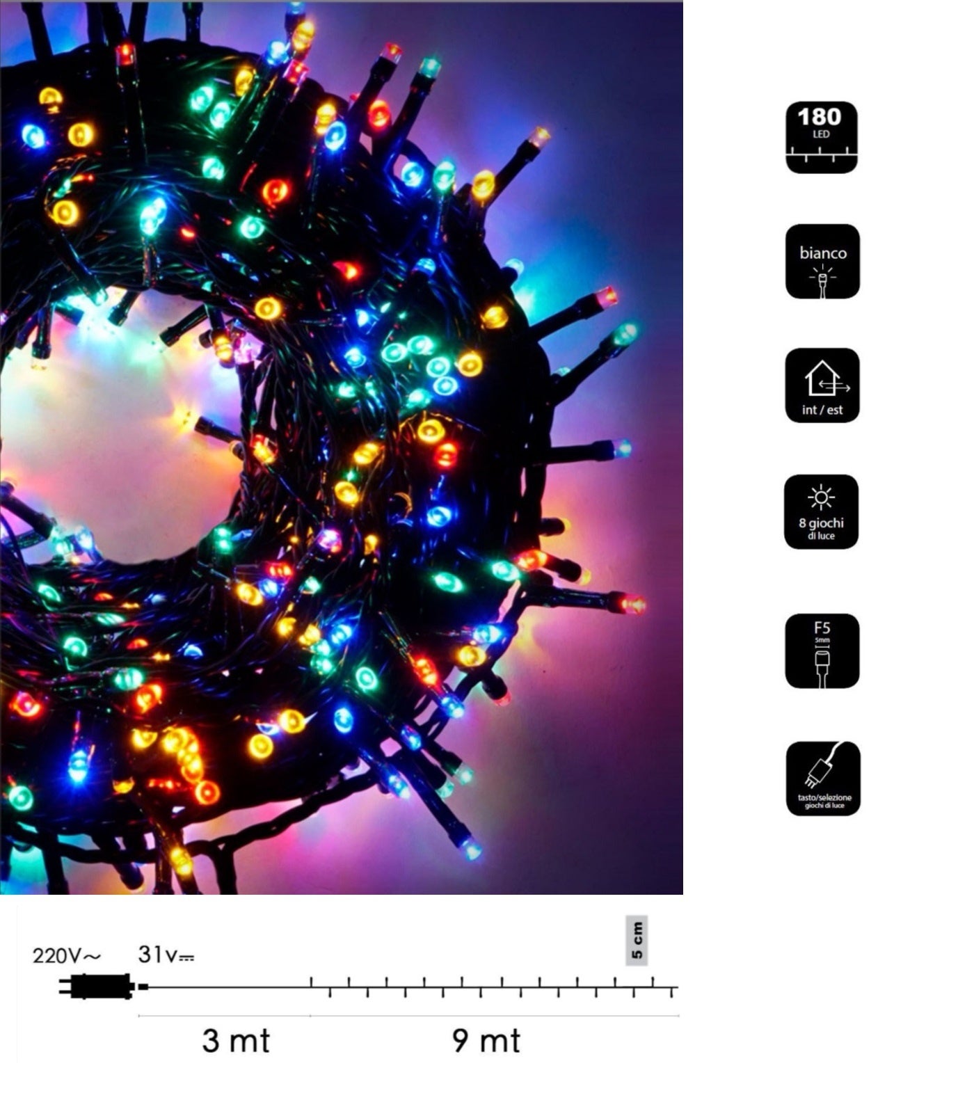 Catena di luci composta da 180 led di 5 mm distribuite in 9 metri di cavo verde. Munita di trasformatore e controller con 8 giochi di luci tra cui pure la modalità fissa.Disponibile in 6 colori di luce: bianca fredda, calda, multicolore, rosso, blu e rosa. Serie luminose ideali per aree interne ed esterne con grado di impermeabilità IP44. Caratteristiche tecniche Modello Catena luminosa Tensione nominale 220V 31V Grado di protezione IP44 Grandezza led 5 mm Quantità led 180 Trasformatore Incluso Controller 8 giochi di luce Area di installazione Interna-Esterna Colore cavo Verde Dimensioni Altezza 5 cm Lunghezza cavo con spina 3 mt Lunghezza catena 9 mt Luce disponibile Bianca-Calda-Multicolore-Blu-Rosso-Rosa