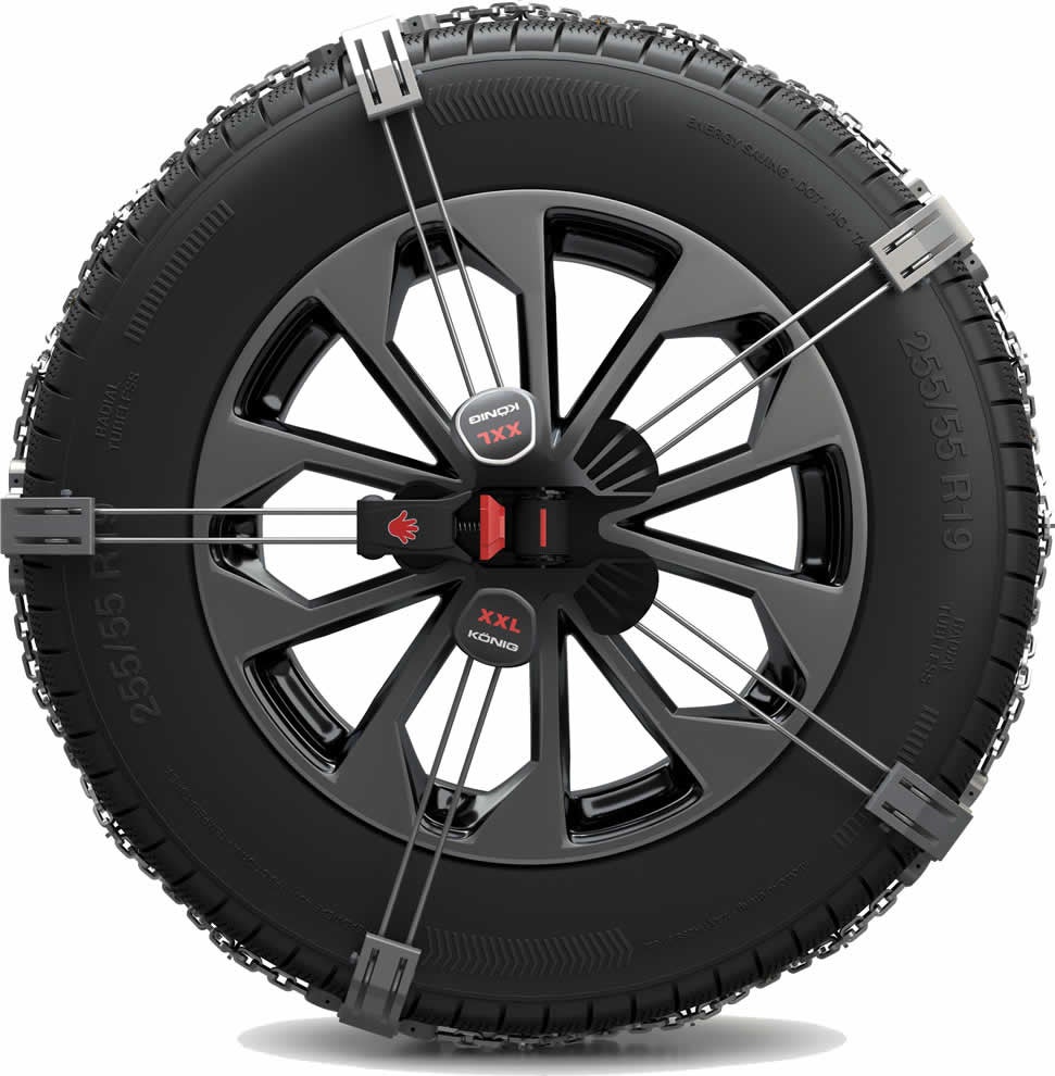 Gli elementi di tensionamento attivi limitano l'ingombro dinamico della catena e permettono l'adattamento perfetto su pneumatici con profili e livelli di usura differenti