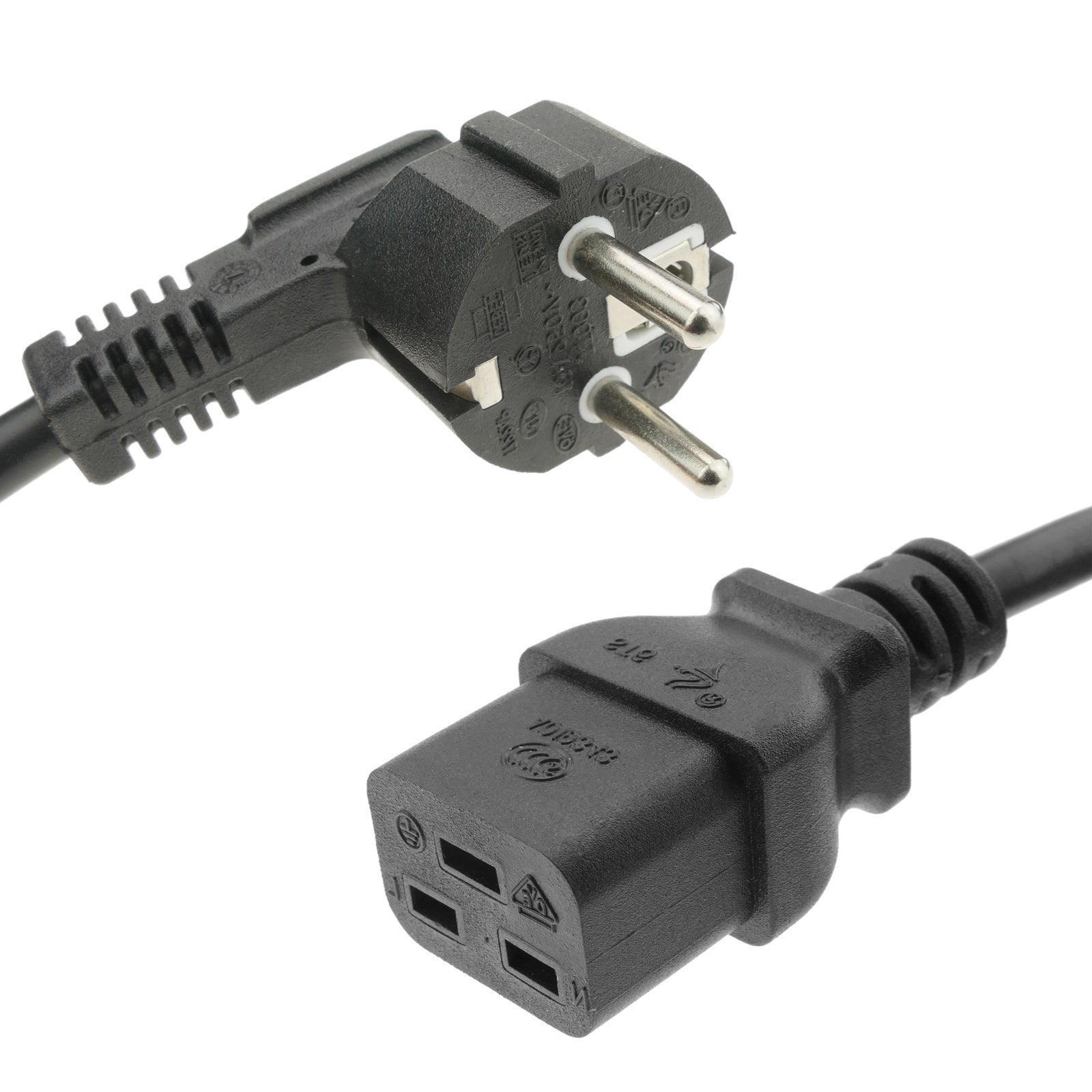 Cavo di alimentazione per apparecchiature elettroniche come PC con un connettore femmina IEC-60320-C19 e un altro connettore Schuko maschio br> Caratteristiche del prodotto DESIGN: Cavo nero con spina diritta rispetto al cavo, questo cavo ha una sezione in rame di 3x1,5mm2 CARATTERISTICHE: Alle estremità del cavo presenta un connettore Schuko maschio e un connettore femmina IEC-60320-C19 per cavo VDE H05VV-F 3G1.5mm² SPECIFICHE: Contiene un connettore femmina polarizzato con 3 pin rettangolari da 16A IDEALE: questo tipo di cavo è ideale per correnti elevate con server ad alte prestazioni, UPS e altre apparecchiature dati MISURE: Il cavo ha una lunghezza di 1,8 m