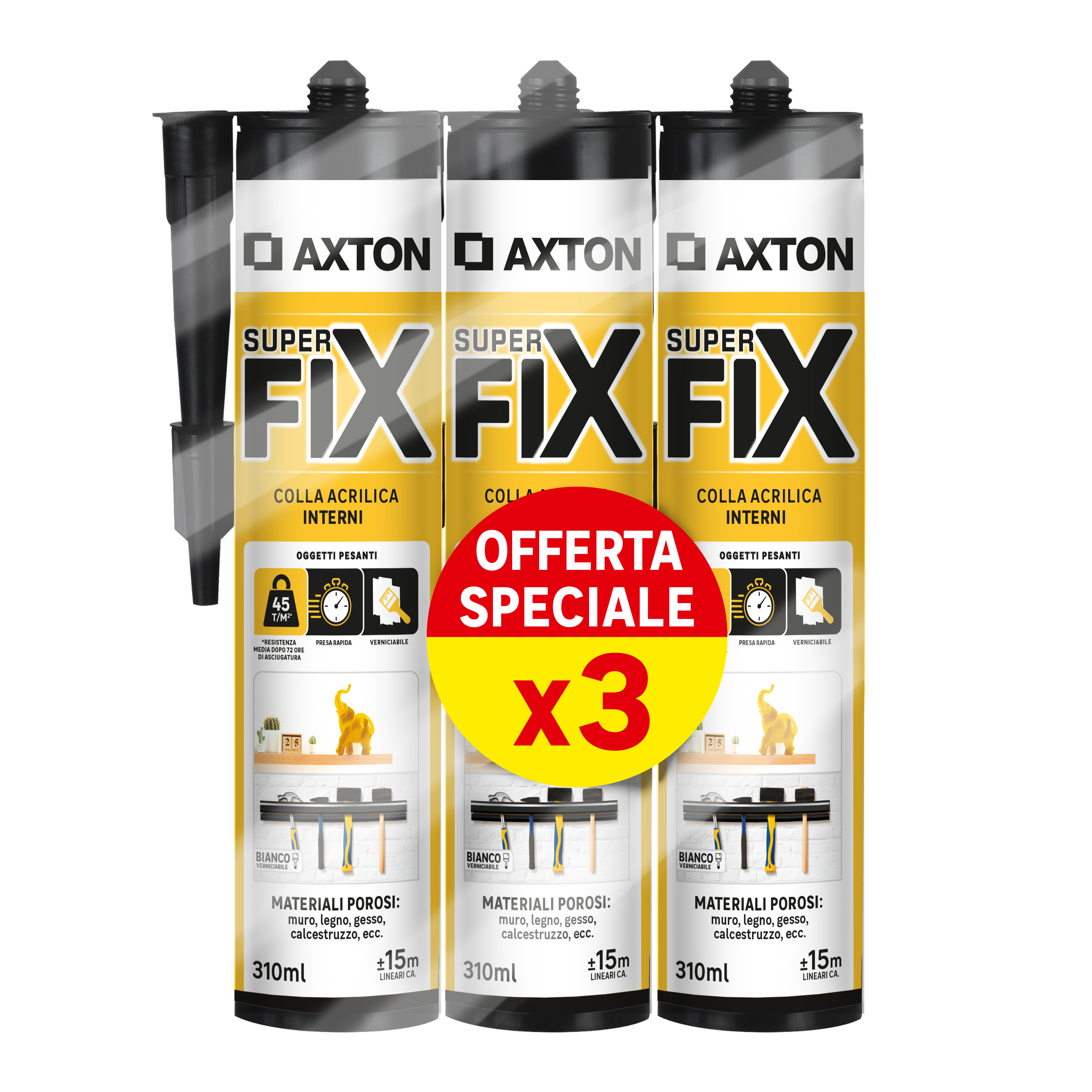 La colla fissativa AXTON Super Fix è facile da usare e garantisce una potente adesione per una tenuta duratura. È perfetta per progetti fai da te a casa o per professionisti dell'edilizia. Grazie alla sua speciale formula, garantisce un fissaggio solido e affidabile, anche per gli oggetti più pesanti. Inoltre, la sua riposizionabilità in 10 minuti consente una regolazione precisa prima che la colla si asciughi completamente. Si applica a supporti porosi Si applica a supporti porosi (legno, listelli, intonaco, calcestruzzo, intonaco, rivestimento in cemento, mattoni). Pulizia con acqua se la colla è fresca e levigatura se la colla è asciutta. Compatibile con la pistola DEXTER.