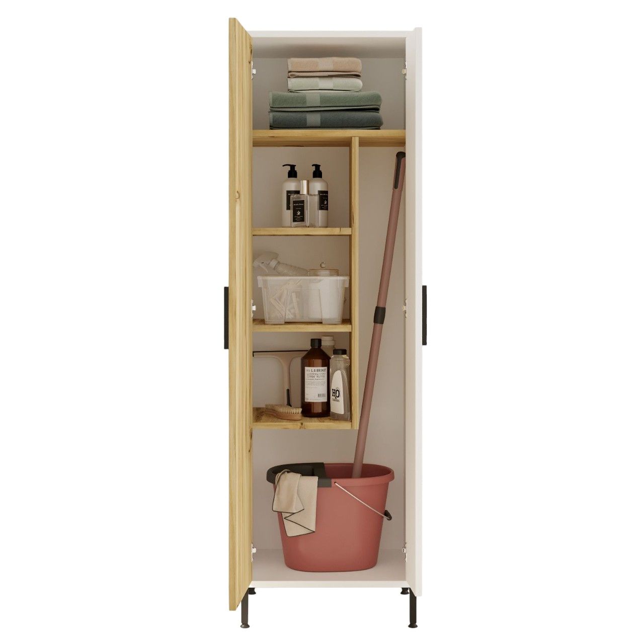 Armadio multiuso da bagno effetto legno rovere e bianco, con vano portascope e mensole.