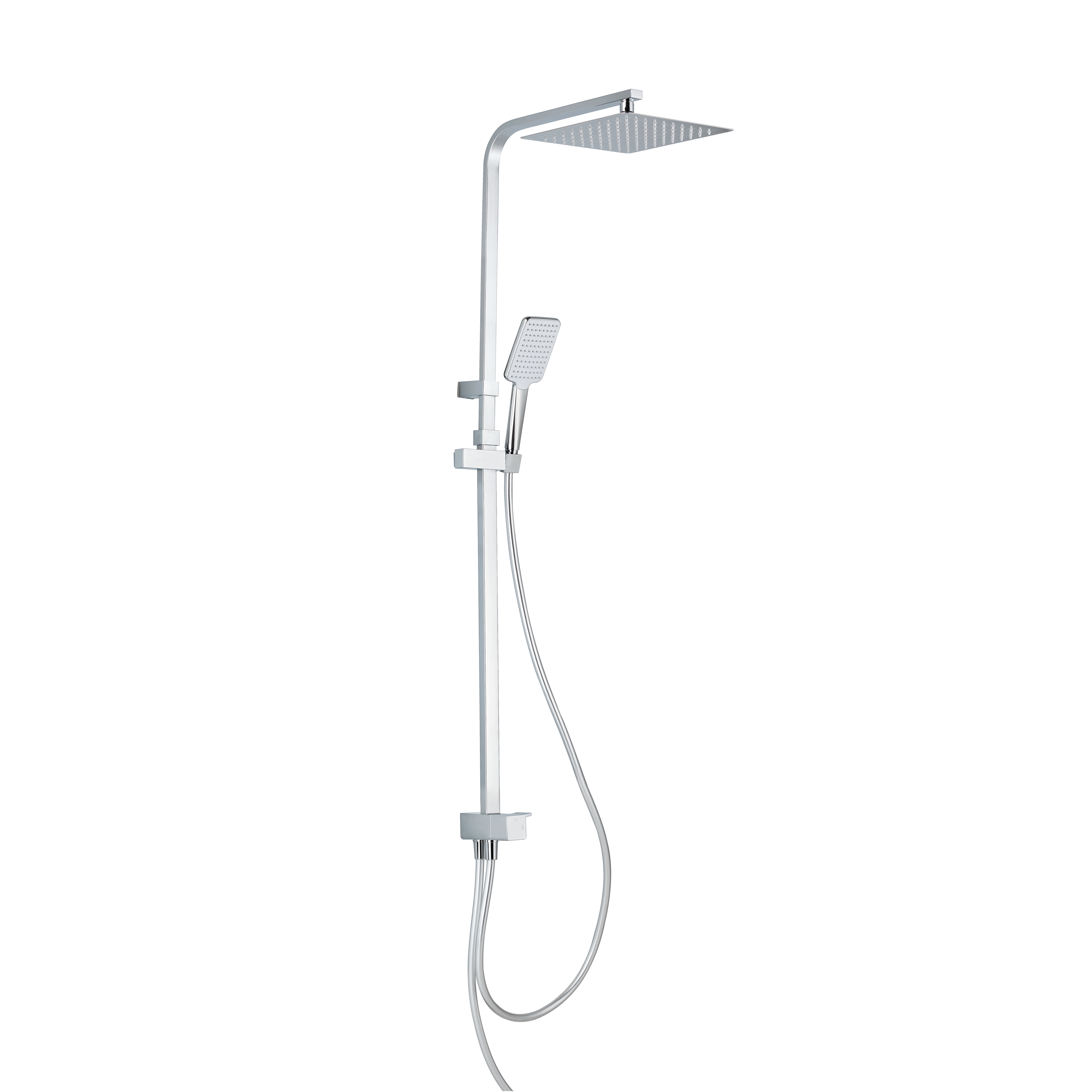 Soffione Doccia 25*25cm ; in Abs, Frontale Bianco, Corpo Cromato con Ugelli In Silicone Trasparente; Tubi In Lega Di Zinco; Cursore Pulsante Posteriore In Abs; Deviatore In Abs, Maniglia In Zinco; Nastro Tubo In Pvc Grigio, Dado E Nucleo In Ottone, Antitorsione.