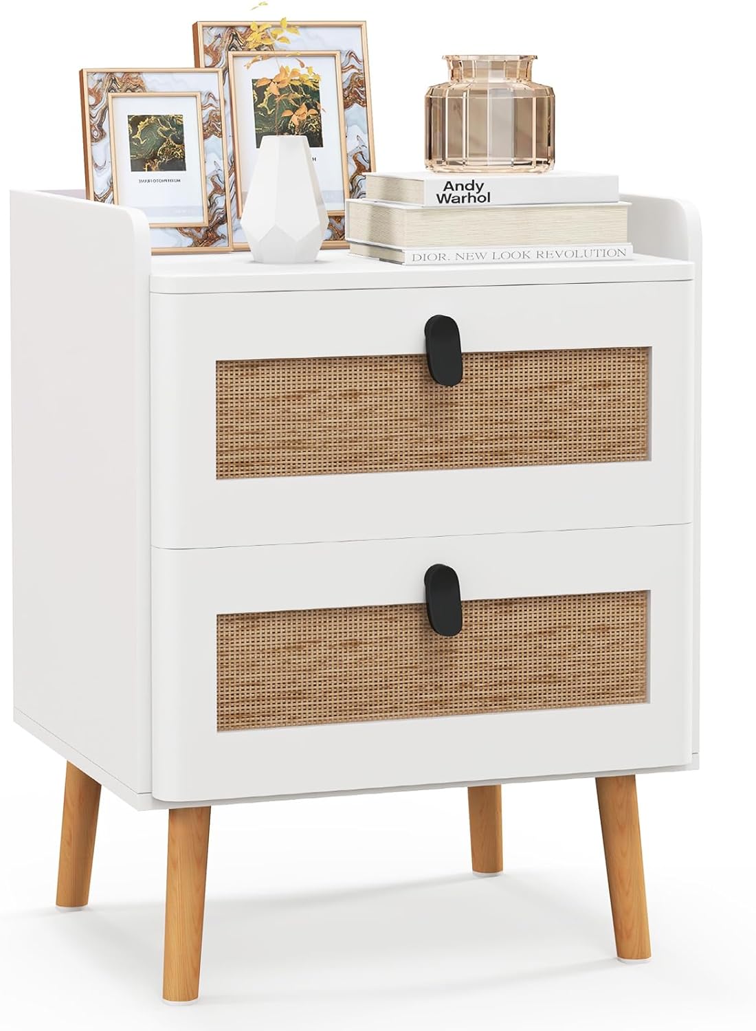 Questo comodino bianco è una grande combinazione di design moderno e rustico. Dispone di 2 spaziosi cassetti per riporre i tuoi oggetti e 4 gambe in legno di pino, che conferiscono un tocco naturale alla tua stanza. Inoltre, questo comodino bianco ha un ampio piano con bordo rialzato per posizionare i tuoi oggetti e impedire loro di cadere. I piedini antiscivolo e il dispositivo anti-ribaltamento lo renderanno sicuro e stabile da utilizzare. Questo comodino bianco combina bellezza estetica con grande praticità, e può essere utilizzato non solo come comodino in camera da letto, ma anche come tavolino laterale, tavolino da caffè, tavolino da salotto e tavolino da divano in piccoli spazi, soggiorno e ufficio.