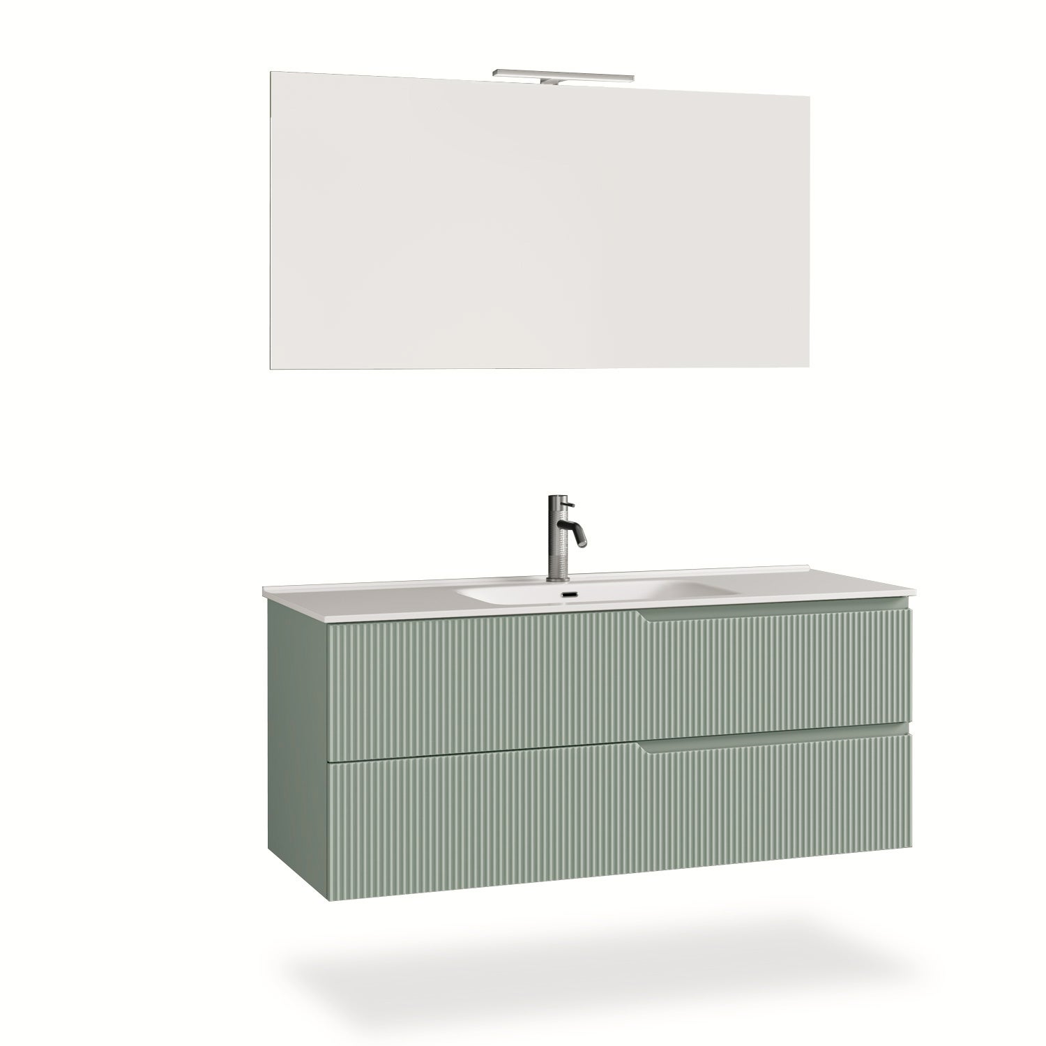 Composizione 4 pezzi VENERE verde salvia • base sospesa con frontali in MDF cannettato, finitura verde salvia • lavabo in ceramica con foro troppopieno • nr.2 cassetti con scorrimento e chiusura soft close • maniglia a gola pantografata • nr.1 specchio reversibile, con telaio in ritiro in abs colore argento • nr.1 lampada led a luce fredda 4000k (non sostituibile), 5W, AC220/240V, 50-60Hz, 380 Lumen, IP44, RoHS, CE, classe energetica F • dimensioni base cm. L.120 P.45 H.50 • dimensioni lavabo cm. L.121 P.46,5 H.20 • dimensioni specchio cm. L.120 P.2 H.60 • dimensioni lampada cm. L.30 P.11 H.8 • dimensioni composizione cm. L.121 P.46,5 H.190 • miscelatore e scarico non inclusi • Made in Italy