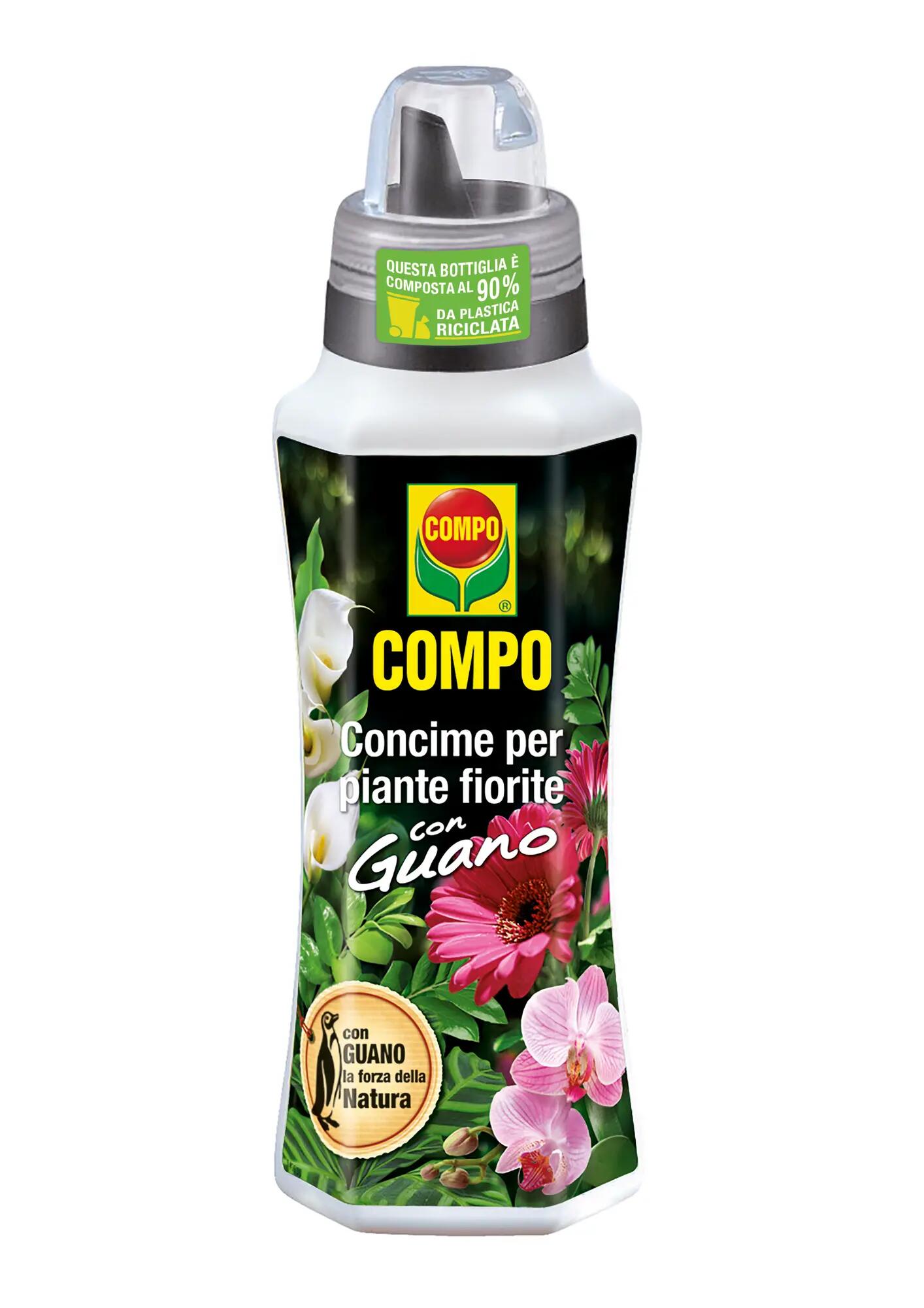 Il concime per piante Fiorite COMPO, fornisce alle tue piante tutti i principali elementi nutritivi di cui ha bisogno. E' arricchito con guano naturale di uccelli marini per favorire la fertilità del suolo e la qualità delle fioriture Ideale per la nutrizione di tutte le piante da fiore annuali e pluriennali, quali: surfinie, petunie, gerani, ibisco, lavanda, begonie, viole, stelle di natale L'azione è immediata fin dalla prima applicazione e rafforza la resistenza delle tue piante e stimola la crescita delle radici. Formulazione bilanciata con microelementi in forma chelata per un più facile assorbimento da parte della pianta Accurata selezione e miscelazione delle materie prime: potassio interamente da solfato per ridurre al minimo l'apporto di cloro, elemento poco tollerato dalle piante Modalità d'uso: Riempire il tappo dosatore con il liquido fino alla tacca indicata Diluire la quantità consigliata in acqua Annaffiare con la soluzione ottenuta alla base della pianta Dosaggio: Tacca I in 1 litri d'acqua Tacca II in 2 litri d'acqua Tacca III in 3 litri d'acqua Numero applicazioni: Da novembre a febbraio: concimare una volta ogni due settimane. Da marzo a ottobre: concimare una volta alla settimana.