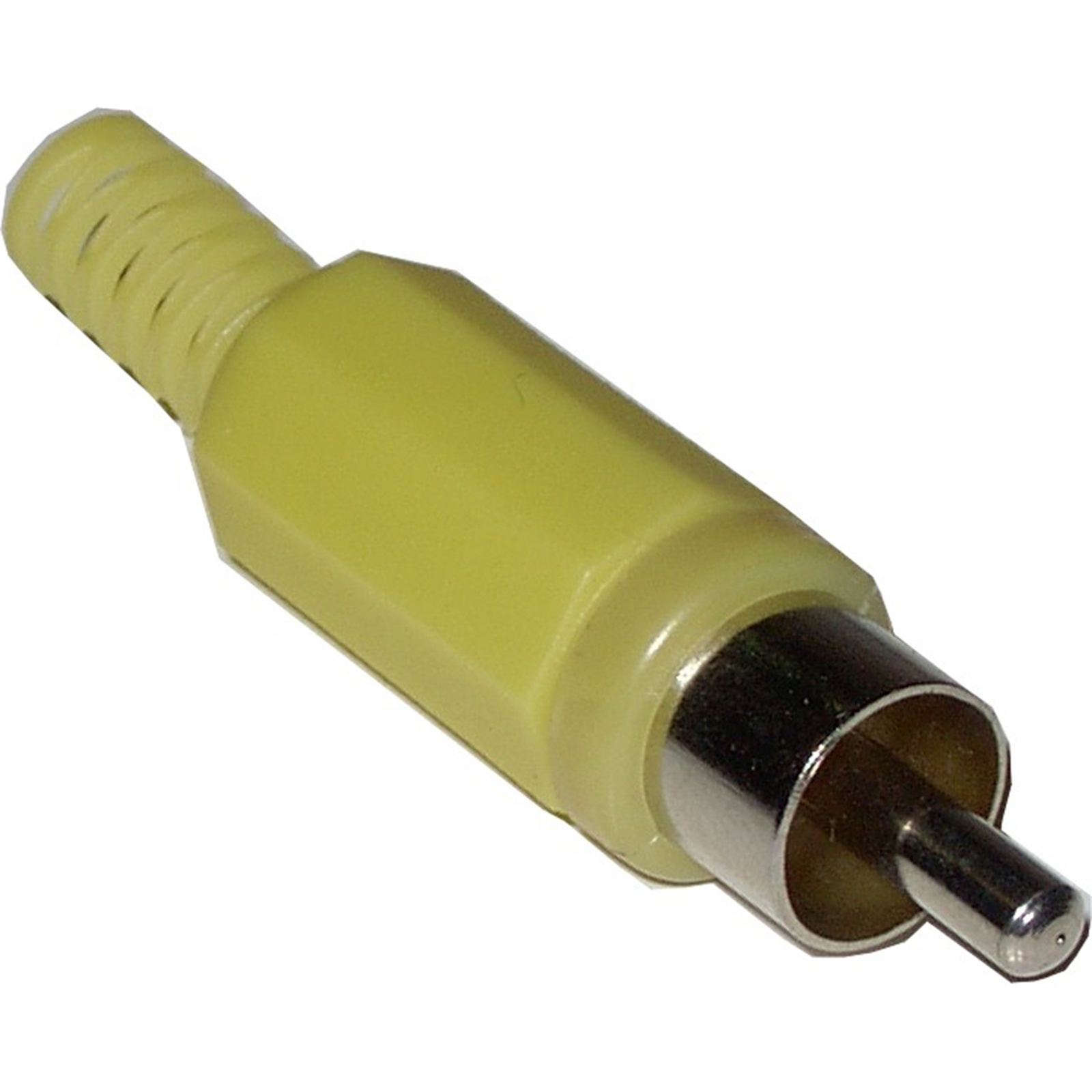 Connettore RCA maschio con copertura in gomma gialla per montaggio su cavo. Comunemente utilizzato nelle connessioni video composite con dispositivi elettronici come televisori, monitor, altoparlanti, amplificatori, ecc.