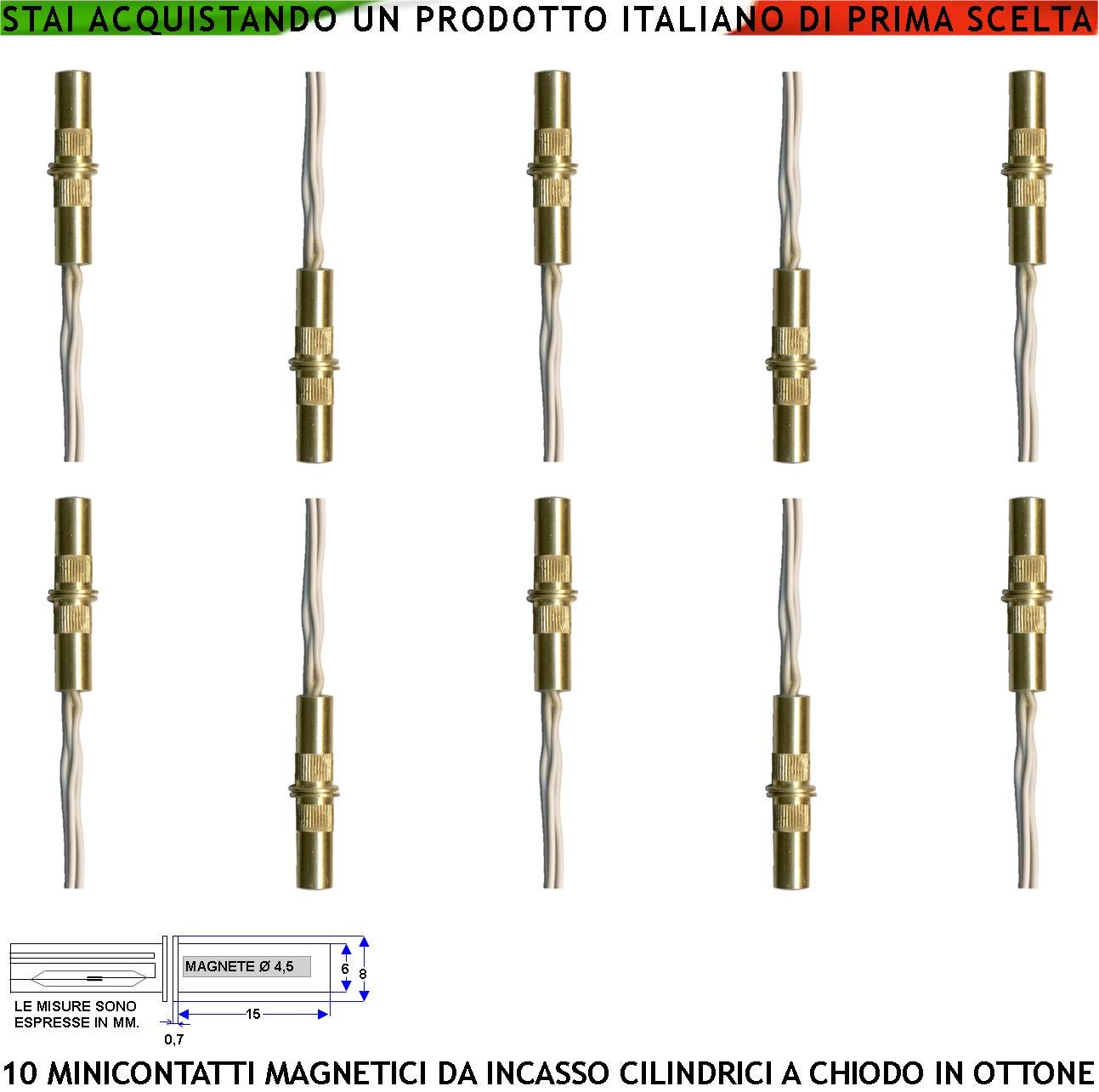 Contatto Magnetico Mini Cilindrico in Ottone 10 Pezzi da Incasso per Allarme Finestre Infissi Reed Sottovuoto NC Campo Attrazione 10 mm Tensione Max 3