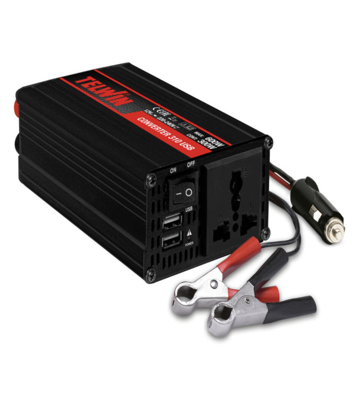 CONVERTITORE INVERTER 12V-230V 310W CON 2 USB - cm.17x9,5x5,4 - 0,8 Kg. convertitore inverter 12V DC - 230V AC ideale per alimentare in auto o camper, TV LCD o plasma, lampade alogene, rasoi, utensili elettrici in generale, e per ricaricare le batterie di computer, palmari, fotocamere digitali, videocamere, cellulari, elettroutensili etc. - collegato alla presa accendisigari del mezzo, converte la tensione a 12V della batteria a 230V - protetto contro l'inversione di polarità ed i sovraccarichi - dotato di 2 prese USB