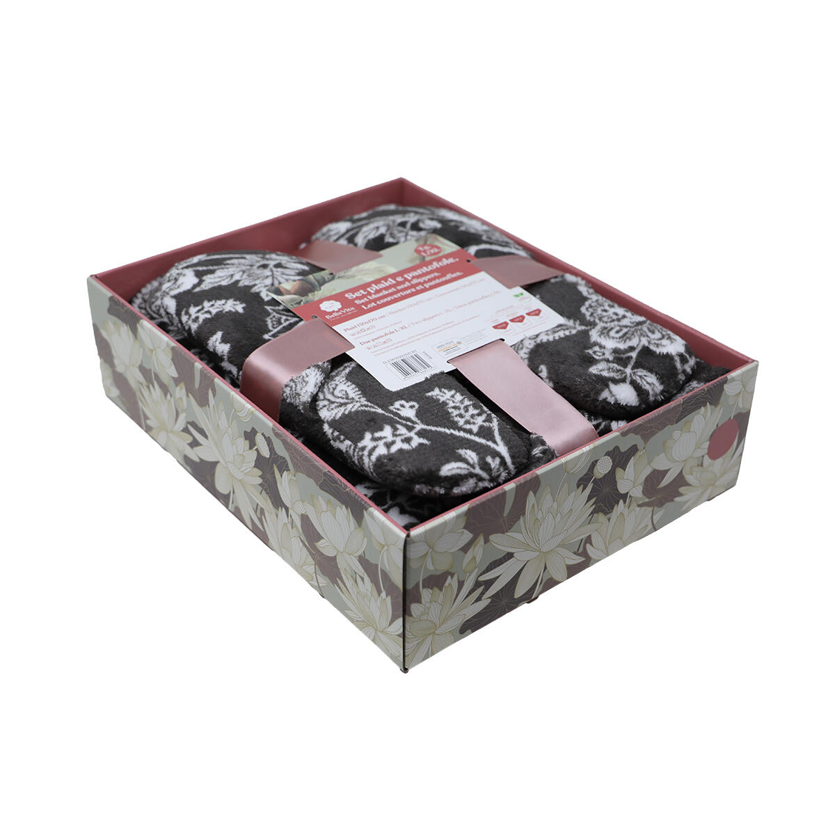Morbido plaid 130×170 cm accompagnato da pantofole soffici L-XL della stessa fantasia invernale e natalizia foglie. Il tutto è riposto in una bellissima scatola decorata a tema.